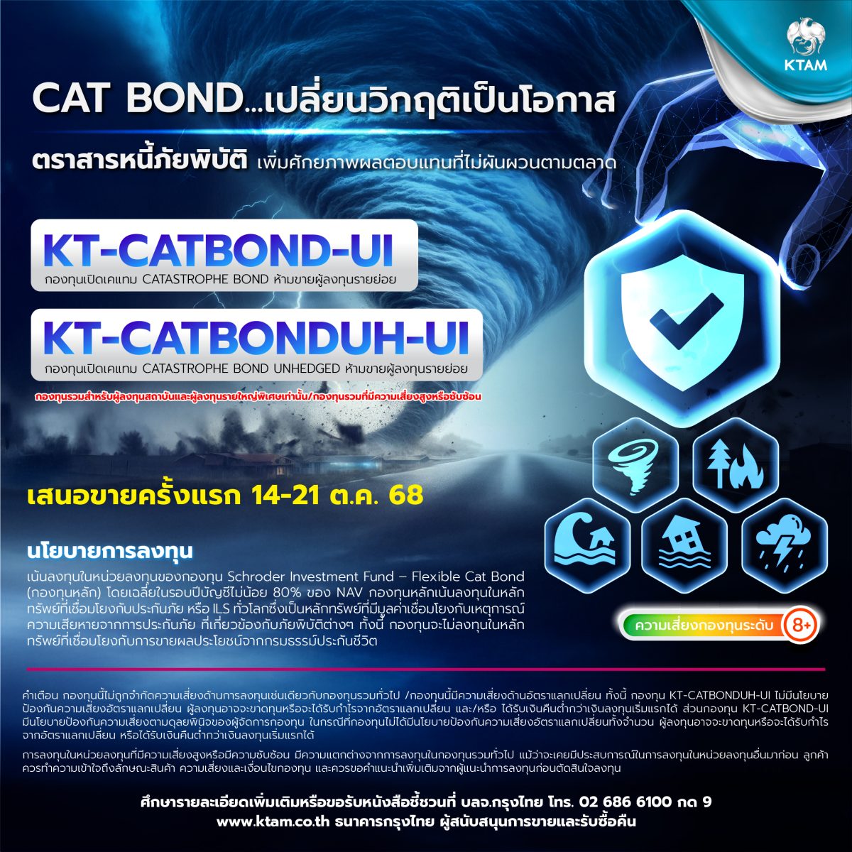 นางชวินดา หาญรัตนกูล กรรมการผู้จัดการ บริษัทหลักทรัพย์จัดการกองทุน กรุงไทย จำกัด (มหาชน) (KTAM) เปิดเผยว่า ปัจจุบันภัยธรรมชาตินับว่ามีความรุนแรงขึ้นทุกปี เช่น พายุเฮอร์ริเคนในสหรัฐฯ ไฟป่าในยุโรป หรือแผ่นดินไหวในญี่ปุ่น ซึ่งนอกจากเกิดการสูญเสียชีวิตและทรัพย์สินแล้ว ยังส่งผลกระทบต่อเศรษฐกิจด้วย เพราะการจ่ายค่าชดเชยต่าง ๆ นั้น อาจเกินกำลังของบริษัทประกันภัยได้ จึงเกิด Catastrophe Bond (CAT BOND) หรือตราสารหนี้ภัยพิบัติที่เป็นตัวช่วยรับความเสี่ยงของบริษัทประกัน โดยเรามองเห็นโอกาสจากตราสารหนี้ภัยพิบัติที่ซ่อนอยู่ท่ามกลางวิกฤต จึงได้เปิดเสนอขายกองทุนรวมสำหรับผู้ลงทุนสถาบันและผู้ลงทุนรายใหญ่พิเศษเท่านั้นที่มีความเสี่ยงสูงหรือมีความซับซ้อน จำนวน 2 กองทุน ได้แก่ กองทุนเปิดเคแทม Catastrophe Bond ห้ามขายผู้ลงทุนรายย่อย (KT-CATBOND-UI) และกองทุนเปิดเคแทม Catastrophe Bond Unhedged ห้ามขายผู้ลงทุนรายย่อย (KT-CATBONDUH-UI) เปิดเสนอขายครั้งแรกระหว่างวันที่ 14 – 21ต.ค. นี้