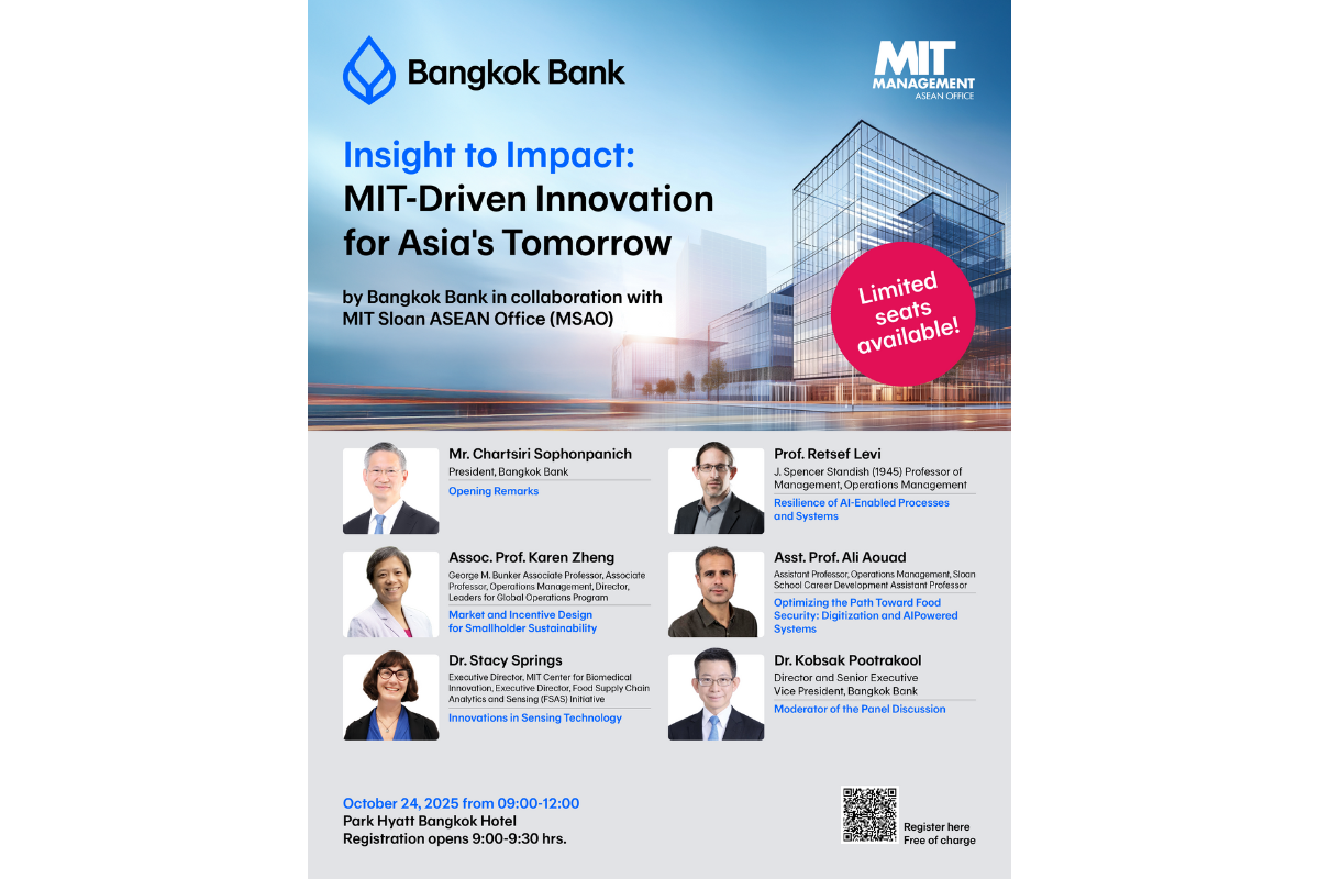 ธนาคารกรุงเทพ จำกัด (มหาชน) ในฐานะ “ธนาคารชั้นนำระดับภูมิภาค” ร่วมกับ สถาบันเทคโนโลยีแมสซาชูเซตส์ (MIT) จัดงานสัมมนา “MIT Half-day Conference” ภายใต้แนวคิด “Insight to Impact: MIT-Driven Innovation for Asia’s Tomorrow” เพื่อเปิดมุมมองการพัฒนาและประยุกต์ใช้นวัตกรรมขับเคลื่อนเศรษฐกิจและสังคมอย่างยั่งยืน โดยเฉพาะด้านเทคโนโลยี AI เกษตรกรรมดิจิทัล และระบบวิเคราะห์ข้อมูลอัจฉริยะ โดยในพิธีเปิดได้รับเกียรติจาก คุณชาติศิริ โสภณพนิช กรรมการผู้จัดการใหญ่ ธนาคารกรุงเทพ กล่าวต้อนรับผู้เข้าร่วมงาน ตอกย้ำพันธกิจของธนาคารในการเป็น “เพื่อนคู่คิด มิตรคู่บ้าน” ที่มุ่งมั่นสนับสนุนความร่วมมือระหว่างภาคการศึกษาและภาคธุรกิจในทุกมิติ เพื่อขับเคลื่อนประเทศไทยและภูมิภาคเอเชียสู่อนาคตแห่งนวัตกรรมอย่างยั่งยืน ในวันศุกร์ที่ 24 ตุลาคม 2568 ณ โรงแรมพาร์ค ไฮแอท กรุงเทพฯ ระหว่างเวลา 9.00-12.00 น.