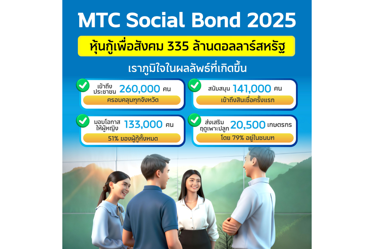 บริษัท เมืองไทย แคปปิตอล จำกัด (มหาชน) หรือ MTC รายงานความคืบหน้าหลังการออกพันธบัตรเพื่อสังคม “Social Bond 2025” มูลค่ารวมกว่า 335 ล้านดอลลาร์สหรัฐ (ประมาณ 11,055 ล้านบาท) โดยสามารถบริหารจัดการและจัดสรรเงินทุนที่ได้รับอย่างมีประสิทธิภาพ เพื่อสนับสนุนโครงการที่มุ่งพัฒนาเศรษฐกิจฐานรากและยกระดับคุณภาพชีวิตของประชาชนไทยอย่างทั่วถึงและเท่าเทียม โดยมุ่งเน้นการสร้างโอกาสทางการเงิน การจ้างงาน และการเกษตรกรรมที่ยั่งยืนในทุกภูมิภาคของประเทศ