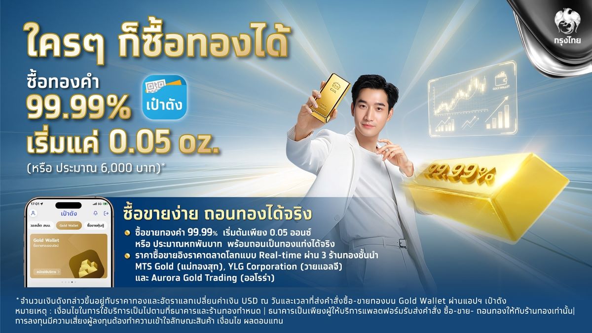 ธนาคารกรุงไทย เดินหน้ายกระดับประสบการณ์การลงทุนทองคำผ่าน Gold Wallet บนแอปพลิเคชัน “เป๋าตัง” ประกาศปรับขนาดขั้นต่ำการซื้อ-ขาย-ถอนทองคำบริสุทธิ์ 99.99% จาก 0.1 ออนซ์ เหลือเพียง 0.05 ออนซ์ มีผลวันที่ 7 พฤศจิกายน 2568 เพื่อเปิดโอกาสให้นักลงทุนรายย่อยเข้าถึงสินทรัพย์ปลอดภัยได้ง่ายขึ้น ท่ามกลางภาวะเศรษฐกิจโลกผันผวน ตอกย้ำบทบาทผู้นำด้านนวัตกรรมการลงทุนของไทย พัฒนาเครื่องมือการลงทุนให้ทันสมัย เข้าถึงง่าย ตอบโจทย์ผู้ลงทุนยุคใหม่