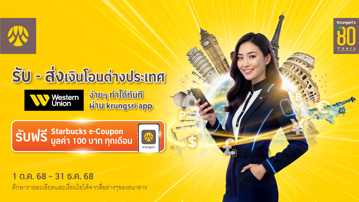 กรุงศรี (ธนาคารกรุงศรีอยุธยา จำกัด (มหาชน)) ชวนลูกค้าสัมผัสประสบการณ์โอนและรับเงินต่างประเทศได้ง่าย สะดวก และรวดเร็ว ด้วย Western Union ผ่าน krungsri app ไม่ต้องสมัครหรือลงทะเบียนเพิ่มเติม เพียงมีบัญชีธนาคารกรุงศรี และ krungsri app ก็สามารถทำรายการได้ทันทีตลอด 24 ชั่วโมงพิเศษ! สำหรับลูกค้าที่ทำรายการ รับ – ส่งเงินโอนต่างประเทศ Western Union ผ่านช่องทาง krungsri app ตั้งแต่ 5,000 บาทขึ้นไป รับฟรี Starbucks e-Coupon มูลค่า 100 บาท ทุกเดือน ตั้งแต่วันที่ 1 ตุลาคม 2568 – 31 ธันวาคม 2568