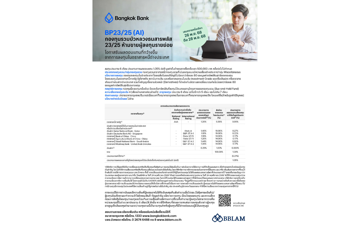 รายงานข่าวจาก บริษัทหลักทรัพย์จัดการกองทุนรวม บัวหลวง จำกัด หรือ BBLAM เปิดเผยว่า BBLAM เสนอขายหน่วยลงทุนครั้งแรก (IPO) กองทุนรวมบัวหลวงธนสารพลัส 23/25 ห้ามขายผู้ลงทุนรายย่อย หรือ BP23/25(AI) ระหว่างวันที่ 26-28 พฤศจิกายน 2568 ประมาณการผลตอบแทน 1.05% ต่อปี โดยเสนอขายในราคา 10 บาทต่อหน่วย และผู้ลงทุนจะต้องจองซื้อครั้งแรกขั้นต่ำ 500,000 บาท