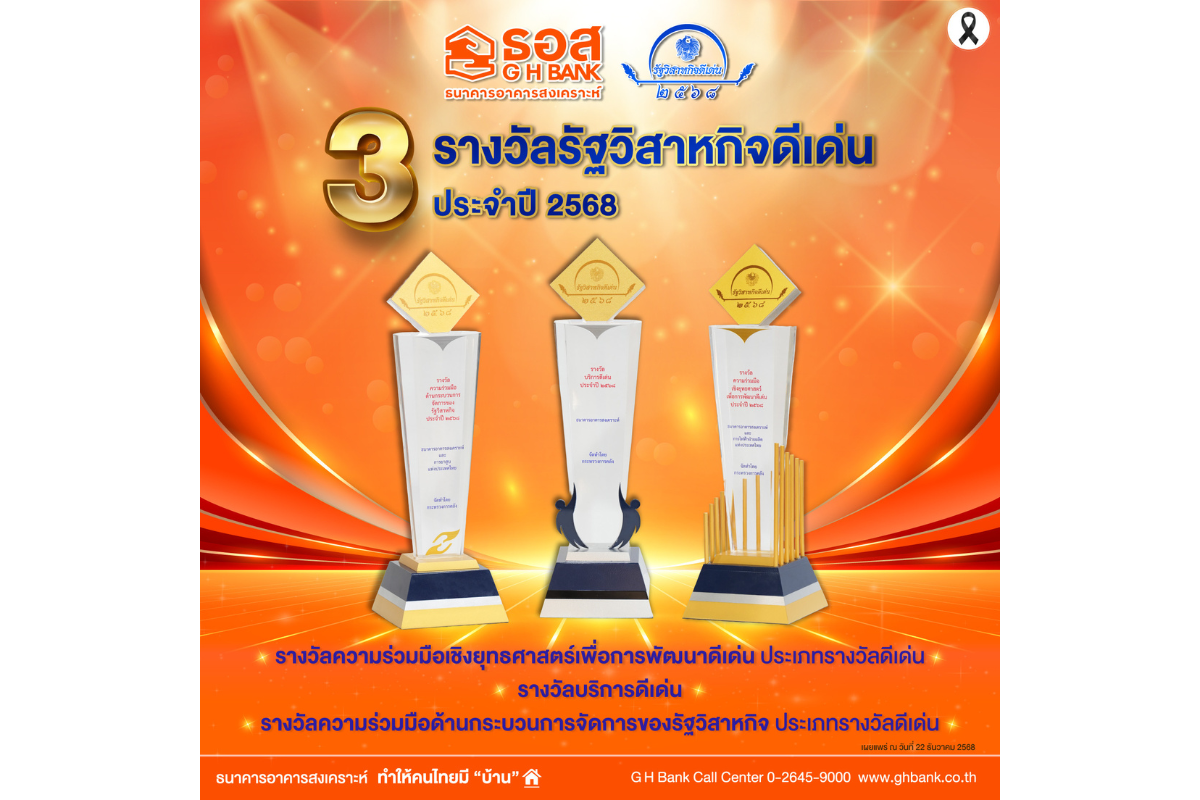 ธนาคารอาคารสงเคราะห์ (ธอส.) รับรางวัลรัฐวิสาหกิจดีเด่น ประจำปี 2568 จากสำนักงานคณะกรรมการนโยบายรัฐวิสาหกิจ (สคร.) จำนวน 3 รางวัล ประกอบด้วย 1. รางวัลความร่วมมือเชิงยุทธศาสตร์เพื่อการพัฒนาดีเด่น ประเภทรางวัลดีเด่น 2. รางวัลบริการดีเด่น และ 3. รางวัลความร่วมมือด้านกระบวนการจัดการของรัฐวิสาหกิจ ประเภทรางวัลดีเด่น ซึ่งรางวัลที่ได้รับสะท้อนการพัฒนาและบริหารจัดการองค์กรได้อย่างมีประสิทธิภาพและเติบโตอย่างยั่งยืน