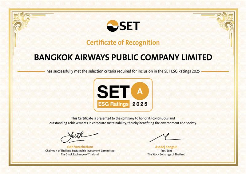 การประเมิน SET ESG Ratings นับเป็นหนึ่งในมาตรฐานด้านความยั่งยืนที่มีความสำคัญของตลาดหลักทรัพย์แห่งประเทศไทย โดยพิจารณาจากการเปิดเผยข้อมูล นโยบาย และผลการดำเนินงานด้านสิ่งแวดล้อม สังคม และบรรษัทภิบาล ในปี 2568 มีบริษัทที่ผ่านเกณฑ์การพิจารณาและได้รับการคัดเลือกทั้งสิ้น 265 บริษัท โดยมีบริษัทที่ได้รับการจัดอันดับในระดับ A จำนวน 67 บริษัท ทั้งนี้ บางกอกแอร์เวย์ส เป็นหนึ่งในบริษัทที่ได้รับการจัดอันดับดังกล่าว ซึ่งช่วยเสริมความน่าเชื่อถือของการดำเนินงานด้าน ESG และสนับสนุนการพัฒนามาตรฐานการดำเนินงานของบริษัทฯ ให้สอดคล้องกับแนวปฏิบัติที่เป็นที่ยอมรับในระดับสากลต่อไป