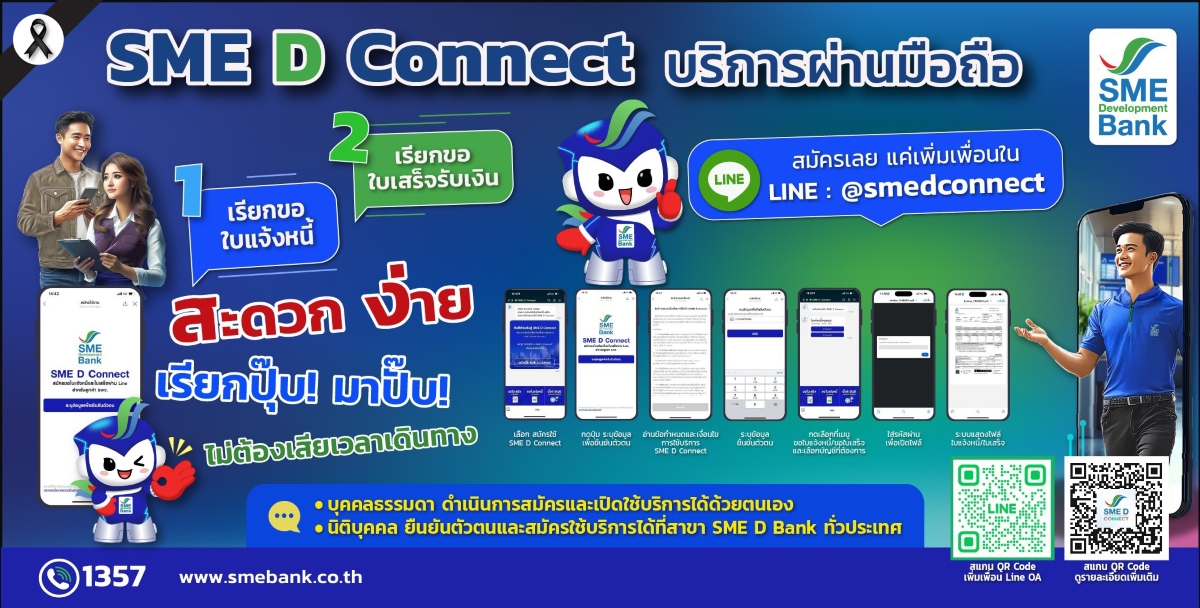 ธนาคารพัฒนาวิสาหกิจขนาดกลางและขนาดย่อมแห่งประเทศไทย (ธพว.) หรือ SME D Bank เปิดบริการใหม่ “SME D Connect” อำนวยความสะดวกให้แก่ลูกค้าธนาคาร ทั้งกลุ่มบุคคลธรรมดา และนิติบุคคล สามารถเรียกขอ “ใบเสร็จรับเงิน” และ “ใบแจ้งหนี้” ได้ทันทีผ่านสมาร์ทโฟน ช่วยเพิ่มความสะดวกสบาย ไม่ต้องเสียเวลาเดินทาง เริ่มใช้งานได้ตั้งแต่วันที่ 7 มกราคม 2569 เป็นต้นไป