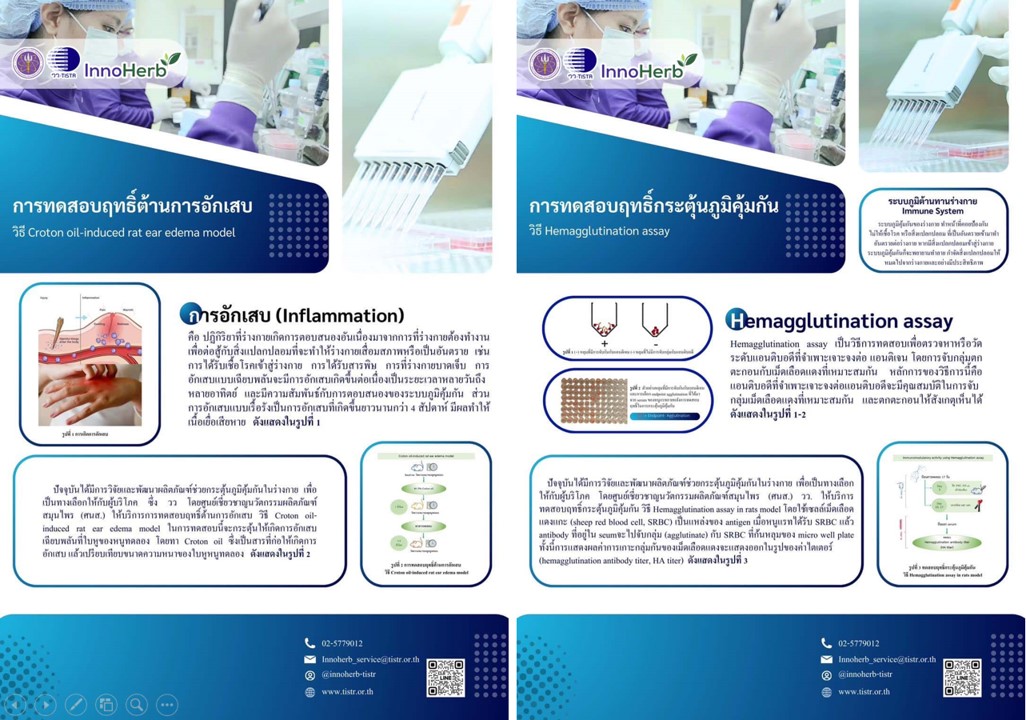กระทรวงการอุดมศึกษา วิทยาศาสตร์ วิจัยและนวัตกรรม (อว.) โดย ศูนย์เชี่ยวชาญนวัตกรรมผลิตภัณฑ์สมุนไพร (ศนส.) สถาบันวิจัยวิทยาศาสตร์และเทคโนโลยีแห่งประเทศไทย (วว.)  ให้บริการทดสอบฤทธิ์ต้านการอักเสบ  และการทดสอบฤทธิ์กระตุ้นภูมิคุ้มกัน  ซึ่งจะเป็นประโยชน์ต่อผู้ประกอบการผลิตธุรกิจสมุนไพรและสารสกัด ในการวิจัยและพัฒนาผลิตภัณฑ์ให้มีมาตรฐาน รวมทั้งอุตสาหกรรมยา อาหารเสริม เครื่องสำอาง เพื่อยืนยันสรรพคุณและขอการรับรองมาตรฐาน ตลอดจนนักวิจัยและนักวิทยาศาสตร์ จะได้ข้อมูลเชิงลึกเพื่อพัฒนาองค์ความรู้ต่อไป และในส่วนของผู้บริโภคนั้นจะได้ผลิตภัณฑ์เพื่อสุขภาพที่ปลอดภัยและมีประสิทธิภาพในการดูแลตนเองให้แข็งแรง