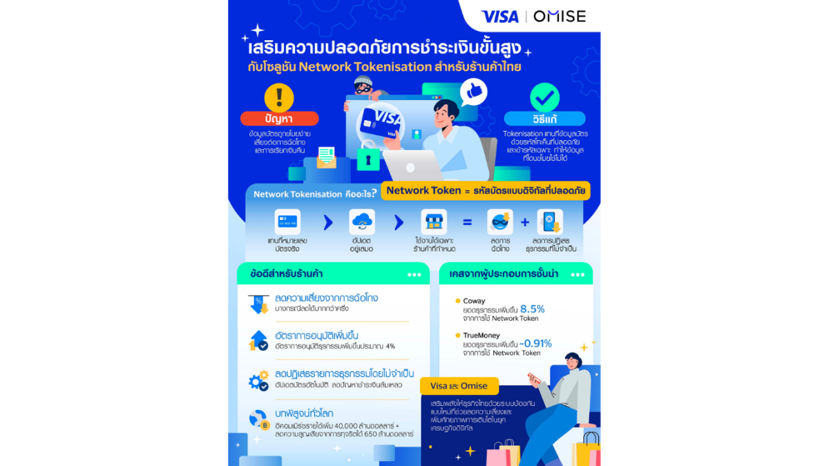 วีซ่า ผู้นำการให้บริการการชำระเงินดิจิทัลระดับโลก และโอมิเซะ ผู้ให้บริการระบบรับชำระเงินชั้นนำในภูมิภาคเอเชียตะวันออกเฉียงใต้ ร่วมมือกันเพื่อนำโซลูชัน Visa Network Token มาสู่ร้านค้าออนไลน์ทั่วประเทศไทย ความร่วมมือนี้มีเป้าหมายเพื่อเสริมความปลอดภัยในการชำระเงิน และสนับสนุนประสบการณ์ดิจิทัลคอมเมิร์ซที่ราบรื่นและเชื่อถือได้ยิ่งขึ้นสำหรับผู้บริโภคชาวไทย