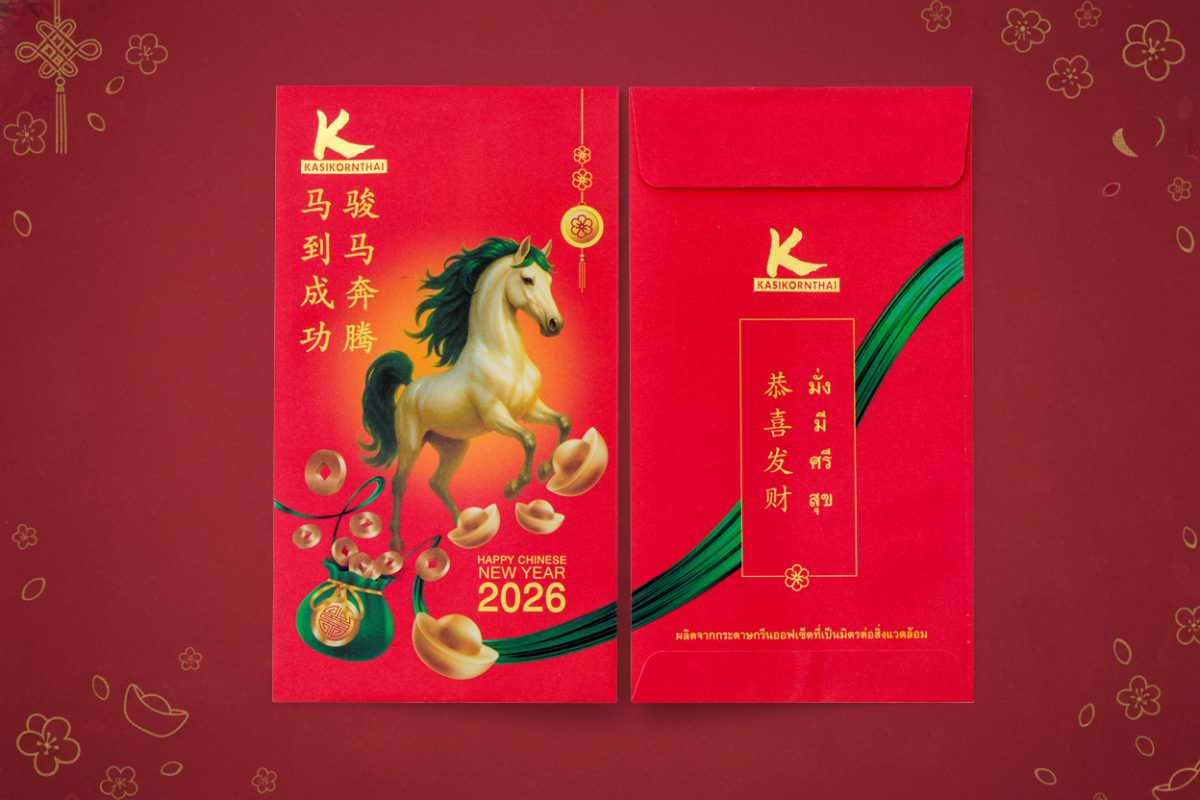 ธนาคารกสิกรไทย ร่วมฉลองตรุษจีน 2569 ปี “มะเมีย” จัดทำซองอั่งเปา “มั่ง มี ศรี สุข” รูปม้าสีทอง ที่เปี่ยมด้วยพลังแห่งความหวัง เฟื่องฟู สวยงามและอ่อนโยน เสริมความเป็นมงคลให้ผู้รับก้าวเข้าสู่ปีใหม่แห่งความมั่งคั่งด้วยหัวใจที่เบิกบานและสง่างาม ดุจม้ามงคลที่กำลังเริ่มต้นวิ่งสู่วันข้างหน้า เป็นซองที่ผลิตจากกระดาษกรีนออฟเซ็ตที่เป็นมิตรต่อสิ่งแวดล้อม จำนวน 2,500,000 ซอง เพื่อมอบให้แก่ลูกค้าสำหรับใส่ธนบัตรแจกจ่ายในช่วงเทศกาลตรุษจีน สามารถติดต่อรับได้ที่ธนาคารกสิกรไทยทุกสาขาทั่วประเทศ ตั้งแต่วันนี้เป็นต้นไป