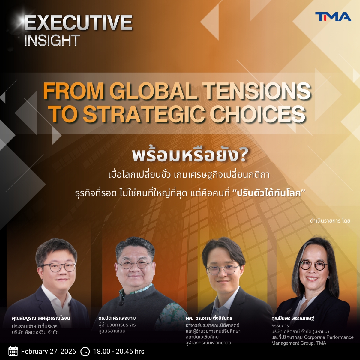 พร้อมหรือยัง? เมื่อโลกเปลี่ยนขั้ว และเกมเศรษฐกิจเปลี่ยนกติกา ในวันที่ธุรกิจจะอยู่รอดได้…ไม่ใช่คนที่ใหญ่ที่สุด แต่คือคนที่ “ปรับตัวได้เร็วที่สุด” ท่ามกลางกระแสความตึงเครียดทางภูมิรัฐศาสตร์ (Geopolitics) และระเบียบเศรษฐกิจหลายขั้วที่กำลังขีดเส้นกติกาการค้าใหม่ ไม่ว่าจะเป็นมาตรฐานเทคโนโลยี หรือเกณฑ์ด้านพลังงานและความยั่งยืน (Sustainability) ปัจจัยเหล่านี้ไม่ใช่เรื่องไกลตัวอีกต่อไป แต่คือกลยุทธ์สำคัญที่กระทบต่อการตัดสินใจทางธุรกิจโดยตรง สมาคมการจัดการธุรกิจแห่งประเทศไทย (TMA) ขอเชิญผู้ที่สนใจเข้าร่วมเจาะลึกวิสัยทัศน์ในงาน “Executive Insight: From Global Tensions to Strategic Choices” เวทีที่จะช่วยให้คุณอ่านเกมการเมืองและเศรษฐกิจโลก โดยวิทยากรผู้ทรงคุณวุฒิ ไม่ว่าจะเป็น