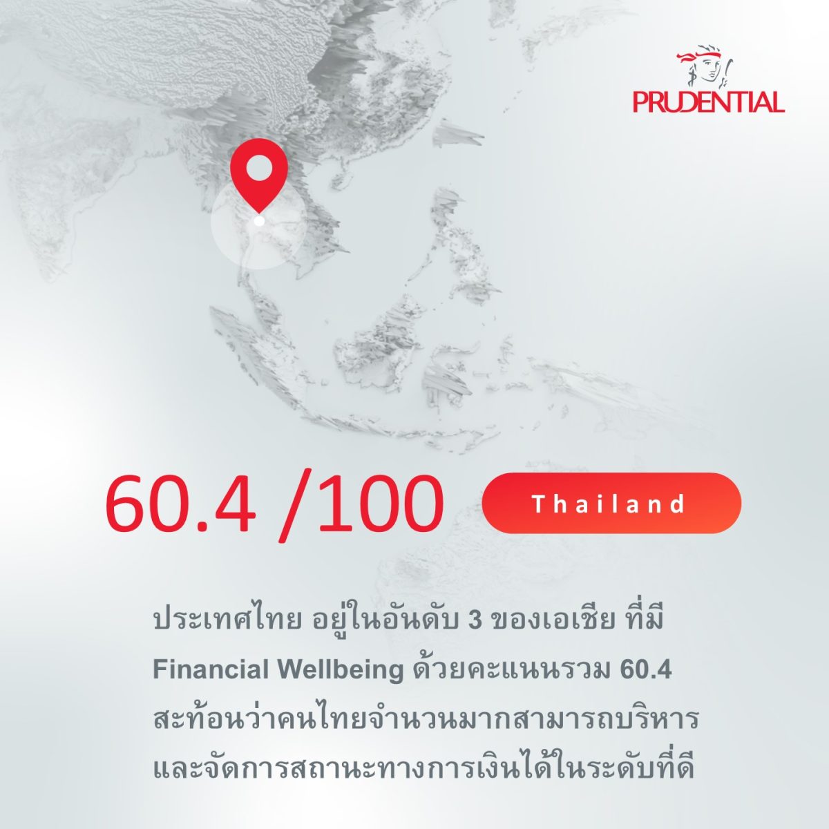 งานวิจัยนี้เป็นฐานข้อมูลสำคัญที่แสดง ดัชนีชี้วัดความเป็นอยู่ที่ดีทางการเงิน (Financial Wellbeing Index) ฉบับแรกของกลุ่มบริษัทพรูเด็นเชียล ครอบคลุมประชากรกว่า 7,000 คนในภูมิภาคเอเชีย ที่มีอายุระหว่าง 18-60 ปี ใน 8 ตลาดหลัก ได้แก่ ฮ่องกง อินโดนีเซีย มาเลเซีย ฟิลิปปินส์ สิงคโปร์ ไต้หวัน เวียดนาม รวมทั้ง ไทย ผลการศึกษาชี้ให้เห็นว่า ทั่วทั้งภูมิภาคเอเชียยังมีช่องว่างที่ชัดเจนระหว่างความมั่นคงทางการเงินปัจจุบัน กับความพร้อมทางการเงินในอนาคต สะท้อนว่าความมั่นใจในวันนี้ ไม่ได้หมายความว่าจะพร้อมรับมือกับอนาคตเสมอไป