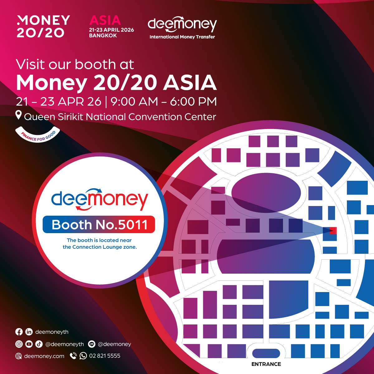 สามารถเรียนรู้เพิ่มเติมเกี่ยวกับวิสัยทัศน์ของ DeeMoney ต่ออนาคตของการเงินระหว่างประเทศ หรือติดตามความเคลื่อนไหวล่าสุดของงาน Money20/20 Asia ได้ที่ www.deemoney.com