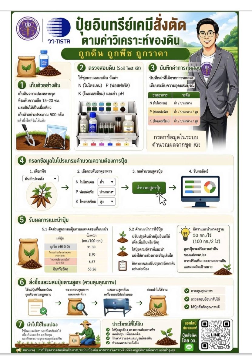 โครงการ “ปุ๋ยสั่งตัดเพื่อ (เกษตรกร) ไทย” ถือเป็นโมเดลต้นแบบในการนำ วิทยาศาสตร์ เทคโนโลยีและนวัตกรรม ที่เหมาะสม มาแก้ปัญหาปากท้องของเกษตรกรอย่างตรงจุด โดยในระยะแรกจะมุ่งเน้นการติดตั้งชุดเครื่องผสมปุ๋ยและแพลตฟอร์มอัจฉริยะให้สหกรณ์การเกษตรนำร่อง 30 แห่ง ในพื้นที่จังหวัดอุดรธานี ชัยนาท และเชียงราย ก่อนจะประเมินผลสัมฤทธิ์เพื่อขยายผลสู่ระดับประเทศ ซึ่งไม่เพียงแต่จะช่วยให้เกษตรกรมีรายได้สุทธิเพิ่มขึ้นจากการลดรายจ่าย แต่ยังเป็นการยกระดับมาตรฐานเกษตรกรรมไทยสู่ “เกษตรแม่นยำ” ที่เป็นมิตรต่อสิ่งแวดล้อมและสร้างความมั่นคงทางอาหารให้กับประเทศในระยะยาวอย่างยั่งยืน