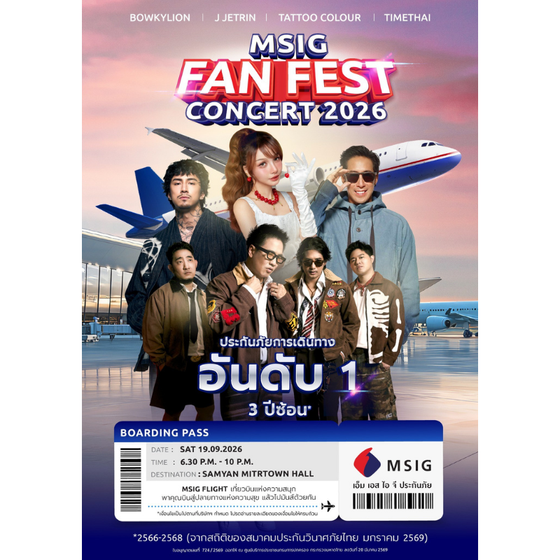 เพื่อขอบคุณและตอบแทนลูกค้าที่ให้ความไว้วางใจกว่า 10 ปีในผลิตภัณฑ์ประกันภัยเดินทางต่างประเทศของบริษัท MSIG เตรียมจัดคอนเสิร์ตใหญ่ “MSIG Fan Fest 2026” พร้อมมอบสิทธิพิเศษสำหรับผู้ที่ซื้อประกันภัยการเดินทาง MSIG Travel Easy Plus ระหว่างวันที่ 1 เมษายน – 30 มิถุนายน 2569 ดังนี้