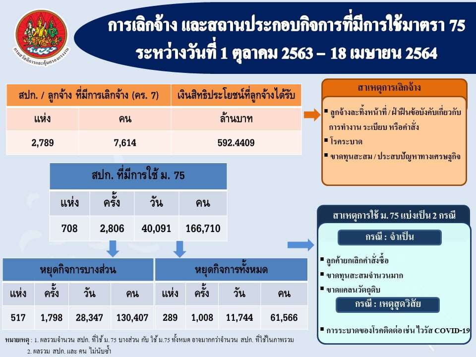 นายอภิญญา สุจริตตานันท์ อธิบดี กสร. กล่าวว่า จากสถิติการเลิกจ้าง ตั้งแต่วันที่ 1 ตุลาคม 2563 – 18 เมษายน 2564 พบว่ามีสถานประกอบกิจการที่เลิกจ้างลูกจ้างจำนวน 2,789 แห่ง จำนวนลูกจ้าง 7,614 คน สูงกว่าช่วงเวลาเดียวกันของปีที่ผ่านมามีสถานประกอบกิจการที่เลิกจ้างลูกจ้างจำนวน 2,708 แห่ง จำนวนลูกจ้าง 6,621 คน และมีการหยุดกิจการตามมาตรา 75 จำนวน 708 แห่ง เป็นการหยุดกิจการบางส่วน 517 แห่ง ลูกจ้าง 130,407 คน และหยุดกิจการทั้งหมด 289 แห่ง ลูกจ้าง 61,566 คน ซึ่งสถานการณ์เช่นนี้ นายจ้างควรนำมาตรการบรรเทาปัญหาการเลิกจ้างมาปรับใช้ ซึ่งมี 3 มาตรการ คือ 1.มาตรการลดค่าใช้จ่าย 2.มาตรการปรับปรุงการบริหารงานบุคคลให้เหมาะสมกับสถานการณ์ และ 3.มาตรการลดจำนวนลูกจ้าง โดยขอให้การเลิกจ้างเป็นทางเลือกสุดท้ายในการตัดสินใจ ทั้งนี้นายจ้างอาจตกลงกับลูกจ้างในการเปลี่ยนแปลงสภาพการจ้าง เช่น ลดวันทำงาน ลดค่าจ้าง ก็สามารถทำได้ แต่จะต้องได้รับความยินยอมจากลูกจ้างด้วย