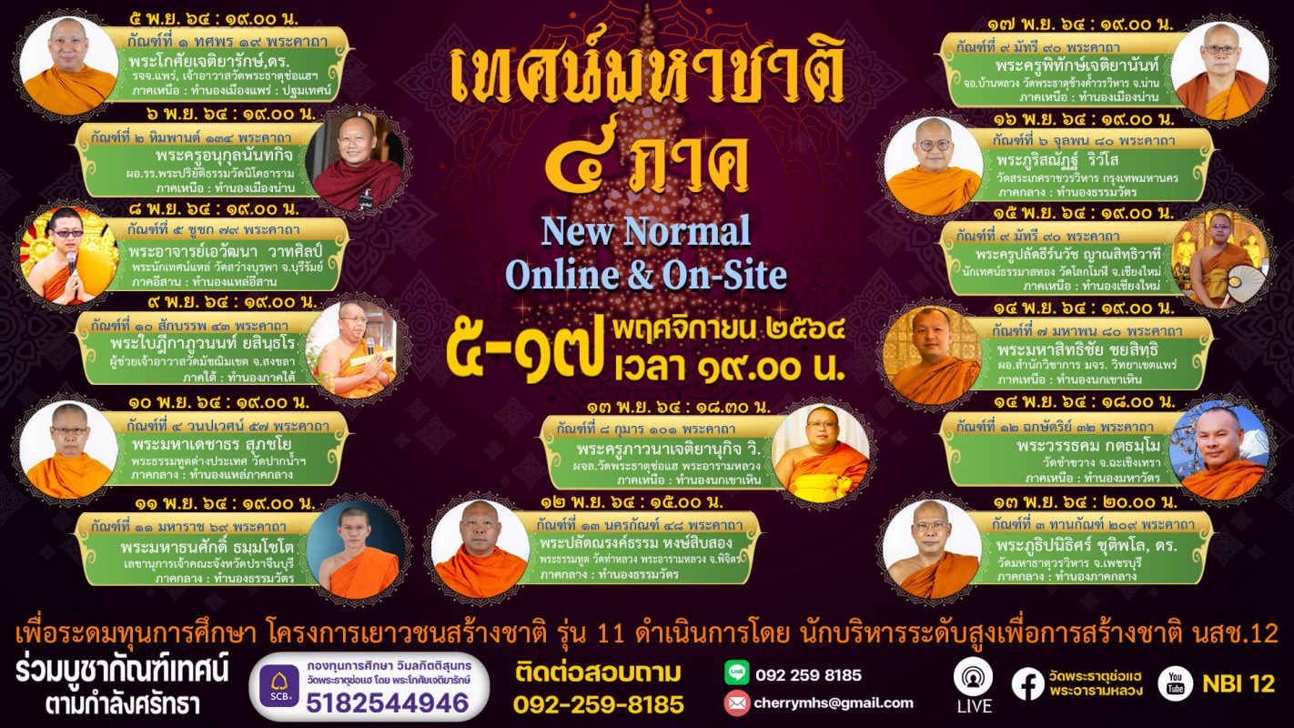 นายชัยวัฒน์ ทองคำคูณ ประธานหลักสูตรนักบริหารระดับสูงเพื่อการสร้างชาติรุ่นที่ 12 เปิดเผยว่านักบริหารระดับสูงเพื่อการสร้างชาติ นสช.รุ่นที่ 12 ได้จัดเทศน์มหาชาติ 4 ภาค 4 ทำนอง มหาเวสสันดรชาดก 13 กัณฑ์ 1,000 พระคาถา เวลา 19.00 น. ทุกวันระหว่างวันที่ 5 ถึง 17 พฤศจิกายน 2564 เพื่อระดมทุนการศึกษา โครงการเยาวชนสร้างชาติ โดยสามารถรับฟังได้ที่ ณ พระอุโบสถ วัดพระธาตุช่อแฮ พระอารามหลวง ตำบลช่อแฮ อำเภอเมืองแพร่ จังหวัดแพร่ หรือรับชมออนไลน์ได้ทาง YouTube และ Facebook: วันพระธาตุช่อแฮ พระอารามหลวง หรือทาง YouTube และ Facebook: NBI 12