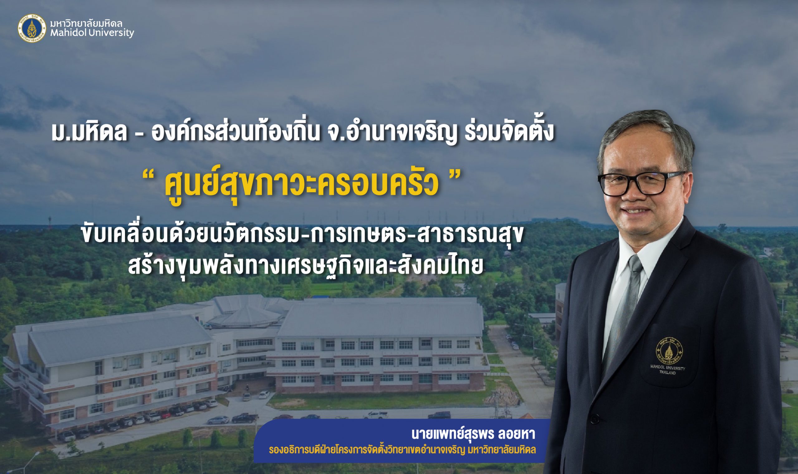 “ด้วยศักยภาพที่ครบพร้อมทั้งในด้านนวัตกรรม-การเกษตร-สาธารณสุขของโครงการจัดตั้งวิทยาเขตอำนาจเจริญ มหาวิทยาลัยมหิดล เชื่อมั่นว่าจะสามารถทำให้”ศูนย์สุขภาวะครอบครัว โครงการจัดตั้งวิทยาเขตอำนาจเจริญ มหาวิทยาลัยมหิดล” เป็นกำลังสำคัญในการ”เขยื้อนภูเขา” หรือ “กับดักทางเศรษฐกิจและสังคม” ของประเทศไทยได้ต่อไปในอนาคต ด้วยชื่อเสียงของมหาวิทยาลัยมหิดลที่พร้อมด้วยความเข้มแข็งทางวิชาการแบบบูรณาการครบวงจร เชื่อมั่นว่าจะสามารถนำพาชุมชนจังหวัดอำนาจเจริญ และประเทศชาติ สู่อนาคตแห่งความเป็นอยู่ที่ดี มั่นคง มั่งคั่ง และยั่งยืนของประชาชนได้อย่างต่อเนื่อง” นายแพทย์สุรพร ลอยหา กล่าว