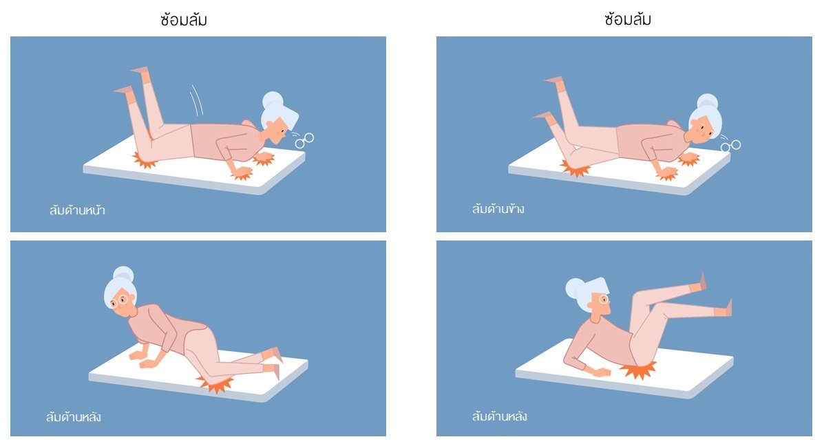 การให้ผู้สูงอายุซ้อมล้มและฝึกลุกเป็นเรื่องที่ไม่ควรละเลย เพราะหากผู้สูงอายุได้รับการฝึกอยู่เป็นประจำจะช่วยลดความรุนแรงของการบาดเจ็บที่จะเกิดขึ้นจากเหตุการณ์ไม่คาดคิดได้ โดยการล้มที่ทำให้บาดเจ็บอย่างรุนแรง มี 2 ลักษณะคือ ล้มศีรษะฟาดกับล้มทั้งยืน ความสำคัญที่จะลดความรุนแรงได้ มี 2 ขั้นตอน คือ 1) เมื่อจะล้มให้พยายามย่อตัวลงในท่านั่ง ขั้นตอนนี้จะช่วยลดแรงกระแทกที่เกิดกับลำตัวและกระดูก 2)ใช้แขนและมือป้องกันศีรษะและลำคอ ในขั้นตอนนี้จะช่วยลดแรงกระแทกที่เกิดกับสมองและกระดูกต้นคอได้ ถ้ากำลังรู้สึกว่าจะหงายหลัง หรือมีอาการเซล้มให้พยายามย่อตัว เก็บคอ คางชิดอก หลังมือประคองด้านหลังศีรษะ และกางขา พยายามให้ด้านข้างของลำตัวกลิ้งลงกับพื้น เพื่อกระจายแรงกระแทก ท่านี้จะช่วยลดแรงกระแทกต่อศีรษะและกระดูกคอได้ แต่หากรู้สึกว่าจะล้มหน้าคว่ำ ให้ใช้ท่า “ขายั้งตั้งคอ งอแขน” โดยพยายามยั้งตัวและย่อขาลงพื้น แขนสองข้างงอเข้าหาตัว ใช้ท่อนแขนส่วนหน้าและฝ่ามือเป็นส่วนรับน้ำหนัก เกร็งคอไม่ให้หน้ากระแทกพื้น ท่านี้จะลดความรุนแรงของการบาดเจ็บที่ศีรษะ สมอง และกระดูกคอ