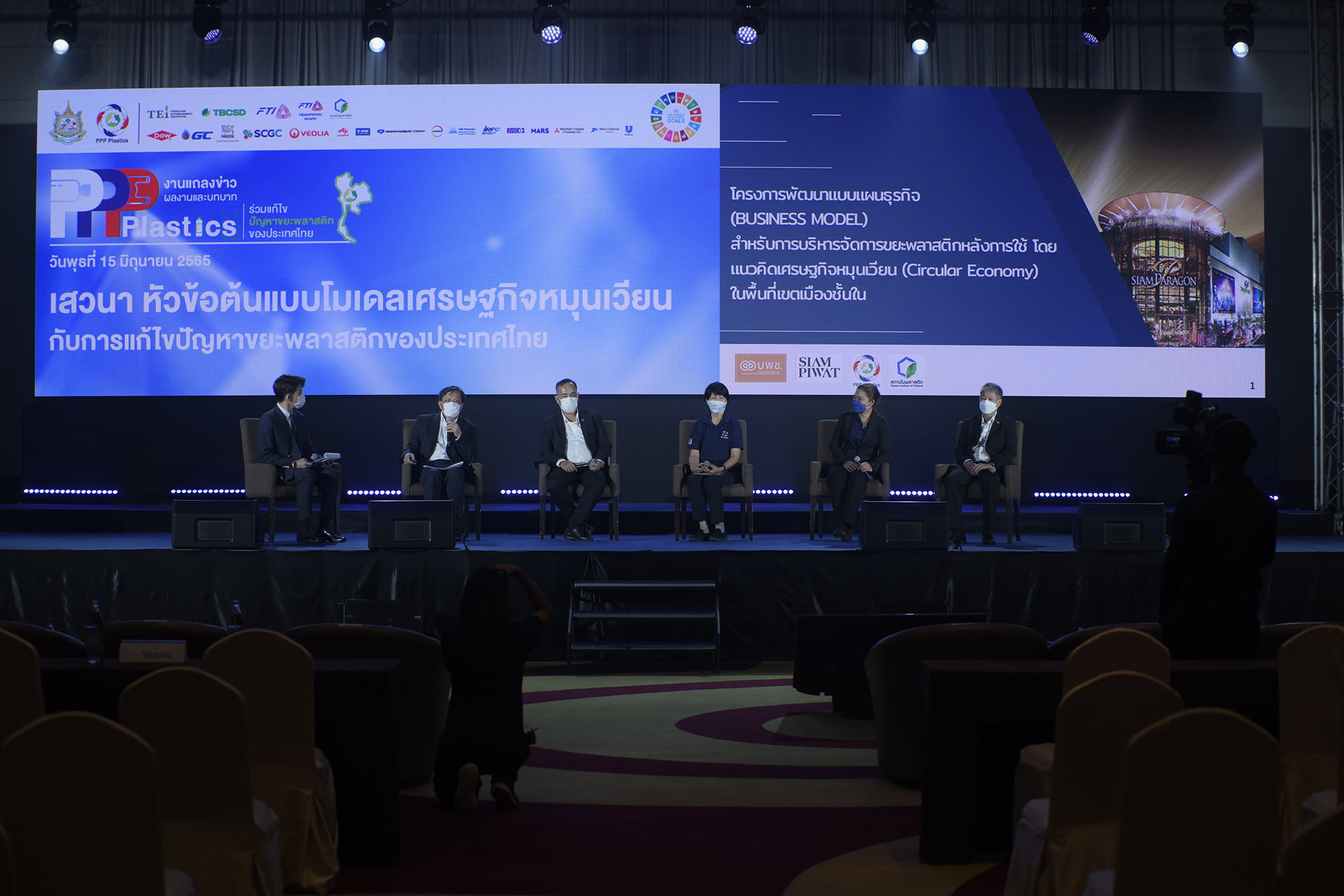 ภายในงานได้มีการเสวนา “ต้นแบบโมเดลเศรษฐกิจหมุนเวียนกับการไขปัญหาขยะพลาสติกของประเทศไทย” ซึ่งเป็นการนำเสนอข้อมูลจากกิจกรรมและโครงการต่าง ๆ ภายใต้ PPP Plastics ที่ร่วมสนับสนุนการขับเคลื่อน Roadmap การจัดการขยะพลาสติก โดย นายวีระ ขวัญเลิศจิตต์ ผู้รับผิดชอบโครงการปทุมวัน กล่าวว่า โครงการพัฒนาแบบแผนธุรกิจ (Business Model) สำหรับการบริหารจัดการขยะพลาสติกหลังการใช้ ภายใต้แนวคิดเศรษฐกิจหมุนเวียนในพื้นที่เขตเมืองชั้นใน โดยเล็งเห็นศักยภาพของพื้นที่เขตปทุมวัน ด้วยการดำเนินโครงการ Siam Pieces ร่วมกับบริษัท สยามพิวรรธน์ จำกัด และจุฬาลงกรณ์มหาวิทยาลัย เพื่อพัฒนาแบบแผนธุรกิจในการนำพลาสติกใช้แล้วทุกชนิดกลับเข้าสู่กระบวนการรีไซเคิลอย่างมีประสิทธิภาพ และสร้างโมเดลการจัดการขยะพลาสติกอย่างยั่งยืน