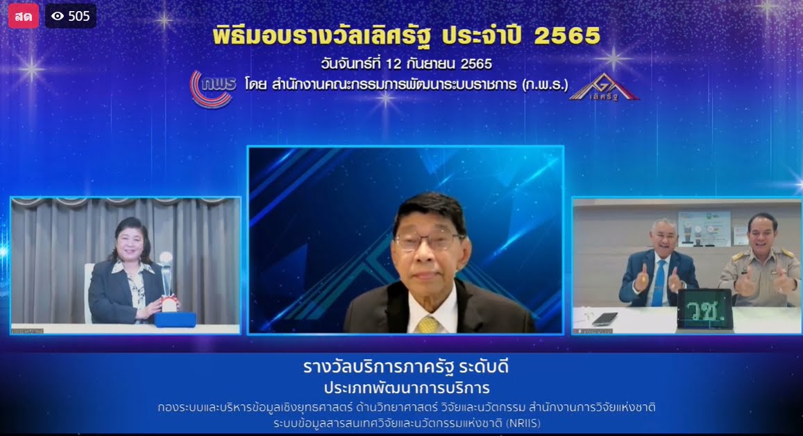 วช. ภาคภูมิใจระบบ NRIIS รับรางวัลแห่งเกียรติยศ “รางวัลเลิศรัฐ ประจำปี 2565” ประเภทพัฒนาการบริการ ระบบข้อมูลสารสนเทศวิจัยและนวัตกรรม (NRIIS)