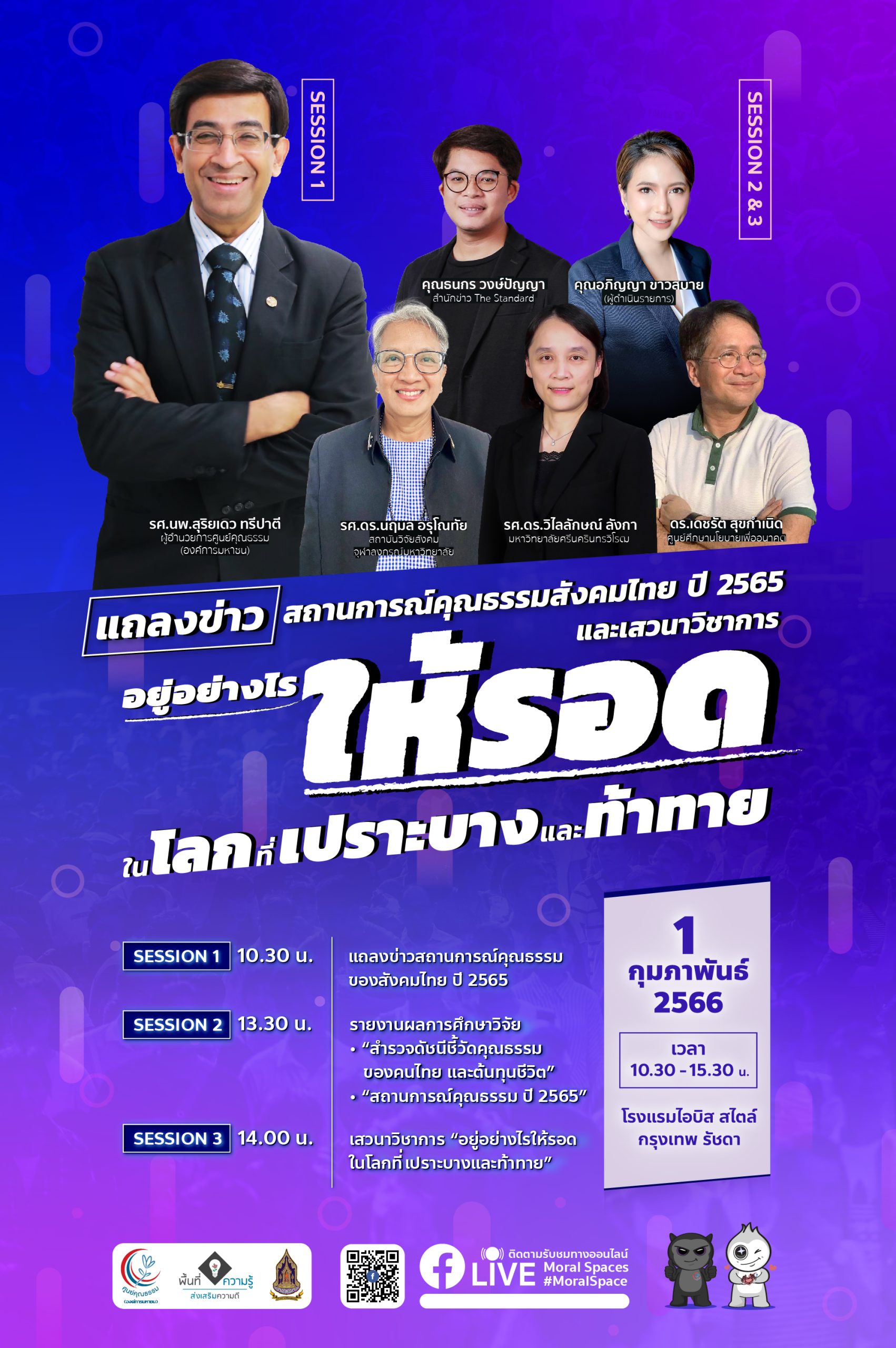 วันพุธที่ 1 กุมภาพันธ์ ศกนี้ เวลา 10.30 น. เป็นต้นไป ณ โรงแรมไอบิสแบงค็อก ศูนย์คุณธรรม องค์การมหาชน จัดงานแถลงข่าวและเสวนาวิชาการ แถลงรายงานสถานการณ์คุณธรรมในสังคมไทยประจำปี 2565 ฉบับล่าสุด เผยผลงานวิจัยเชิงสังคม สะท้อนทัศนคติของคนไทยและสังคมไทยที่มีต่อ “คุณธรรม” ในยุคปัจจุบัน  พร้อมเปิดเวทีวิชาการร่วมถกประเด็น “สถานการณ์สำคัญในมิติคุณธรรม” ภาพรวมคุณธรรมคนไทยมองตัวเองแค่พอใช้  ยังยึดมั่นกตัญญู วัยเกษียณลดความพอเพียง