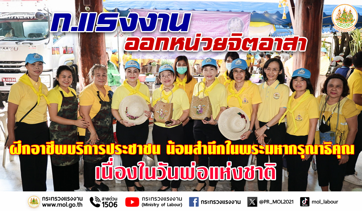 วันที่ 4 ธันวาคม 2566 นายไพโรจน์ โชติกเสถียร ปลัดกระทรวงแรงงาน มอบหมายให้ นางสาวกรจิรัฏฐ์ พงจันทร์ศธร ผู้ช่วยปลัดกระทรวงแรงงาน และคณะ ลงพื้นที่เยี่ยมชมกิจกรรมจิตอาสาออกหน่วยบริการฝึกอาชีพแก่ประชาชนของกระทรวงแรงงาน เนื่องในวันคล้ายวันพระบรมราชสมภพพระบาทสมเด็จพระบรมชนกาธิเบศร มหาภูมิพลอดุลยเดชมหาราช บรมนาถบพิตร วันชาติ และวันพ่อแห่งชาติ 5 ธันวาคม 2566 โดยมี นางสาวบุปผา เรืองสุด อธิบดีกรมพัฒนาฝีมือแรงงาน นางเธียรรัตน์ นะวะมะวัฒน์ อดีตรองปลัดกระทรวงแรงงาน ร่วมเยี่ยมชมกิจกรรมดังกล่าวด้วย ณ วัดปากน้ำภาษีเจริญ เขตภาษีเจริญ กรุงเทพมหานคร