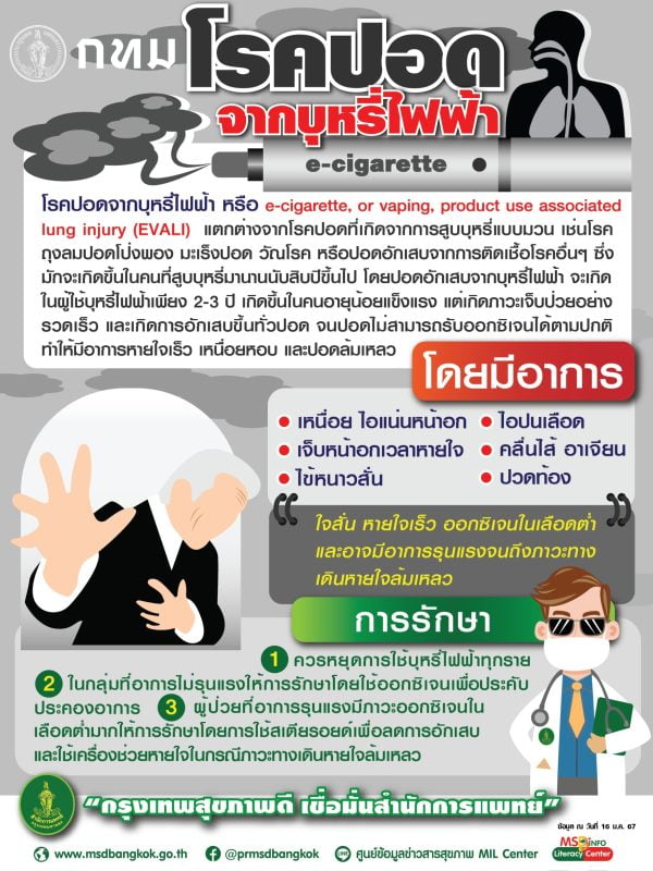 นอกจากนั้น ได้สร้างความรู้ความเข้าใจเกี่ยวกับโทษและพิษภัยบุหรี่ไฟฟ้าแก่เด็กและเยาวชนในโรงเรียนและสถานพยาบาลของ กทม.โดยโรคปอดจากบุหรี่ไฟฟ้า แตกต่างจากโรคปอดที่เกิดจากการสูบบุหรี่แบบมวน เช่น โรคถุงลมปอดโป่งพอง มะเร็งปอด วัณโรค หรือปอดอักเสบจากการติดเชื้อโรคอื่น ๆ ซึ่งมักจะเกิดขึ้นในคนที่สูบบุหรี่มานานนับสิบปีขึ้นไป โดยปอดอักเสบจากบุหรี่ไฟฟ้าจะเกิดในผู้ใช้บุหรี่ไฟฟ้าเพียง 2-3 ปี เกิดขึ้นในคนอายุน้อย แข็งแรง แต่เกิดภาวะเจ็บป่วยอย่างรวดเร็ว และเกิดการอักเสบขึ้นทั่วปอด จนปอดไม่สามารถรับออกซิเจนได้ตามปกติ ทำให้มีอาการหายใจเร็ว เหนื่อยหอบ และปอดล้มเหลว ข้อพึงสังเกตจะมีอาการเหนื่อย ไอแน่นหน้าอก ไอปนเลือด เจ็บหน้าอกเวลาหายใจ คลื่นไส้ อาเจียน ไข้หนาวสั่น ปวดท้อง ใจสั่น หายใจเร็ว ออกซิเจนในเลือดต่ำ และอาจมีอาการรุนแรงจนถึงภาวะทางเดินหายใจล้มเหลว ทั้งนี้ หากมีอาการเจ็บป่วยให้รีบพบแพทย์ทันที หรือพบแพทย์ผ่าน Telemedicine ผ่านแอปพลิเคชัน “หมอ กทม.” เพื่อตรวจวินิจฉัยอาการได้อย่างรวดเร็ว หรือหากต้องการปรึกษาเรื่องสุขภาพสามารถ โทร. สายด่วน 1646 สายด่วนสุขภาพ สำนักการแพทย์ ซึ่งให้บริการตลอด 24 ชั่วโมง