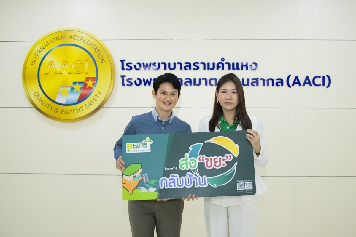 คุณพรเพ็ญ เผ่ารัชตพิบูลย์ รองกรรมการผู้จัดการสายงานปฏิบัติการ ผู้บริหารกลุ่มบริษัท เบตเตอร์ กรุ๊ป (ขวา) โดย บริษัท เบตเตอร์ เวิลด์ กรีน จำกัด (มหาชน) รับมอบชุดยูนิฟอร์มเก่า, ผ้าเก่า ผ้าขาดชำรุด ที่ผ่านกระบวนการฆ่าเชื้อแล้วจำนวนทั้งสิ้น 7,444 ชิ้น จากคุณทัศน์วรรณ ศิริวงศ์ กรรมการบริหารโรงพยาบาลรามคำแหง จำกัด (มหาชน) เข้าโครงการ “ส่งขยะกลับบ้าน” เพื่อเข้าสู่กระบวนการแปรรูปไปเป็นพลังงานทดแทนในการผลิตกระแสไฟฟ้า ด้วยการเปลี่ยนขยะให้เป็นพลังงาน ณ อาคาร C ชั้น 10 โรงพยาบาลรามคำแหง จำกัด (มหาชน) เขตบางกะปิ กรุงเทพมหานคร