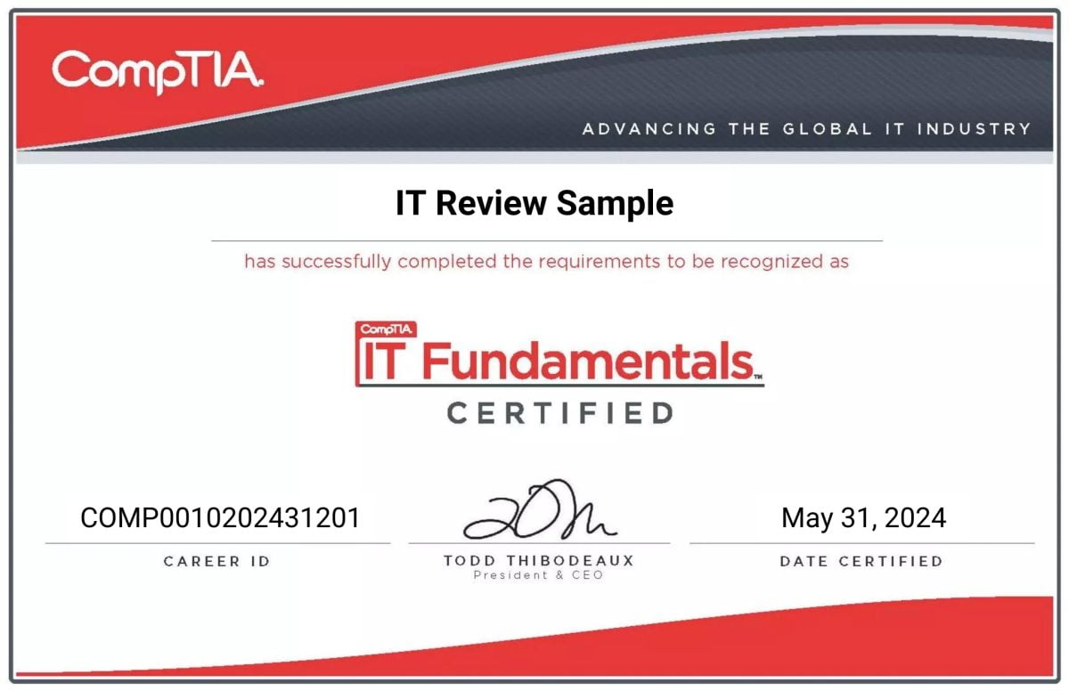 CompTIA : CompTIA IT Fundamentals เป็นใบรับรองระดับเริ่มต้นที่เหมาะสำหรับผู้ที่กำลังพิจารณาอาชีพด้านไอที หรือต้องการความเข้าใจพื้นฐานเกี่ยวกับแนวคิดด้านไอที หลักสูตรนี้เตรียมคุณให้พร้อมสำหรับการตั้งค่าเวิร์กสเตชันพื้นฐาน ติดตั้งฮาร์ดแวร์/ซอฟต์แวร์ สร้างการเชื่อมต่อระบบเครือข่าย แก้ไขปัญหาความเข้ากันได้