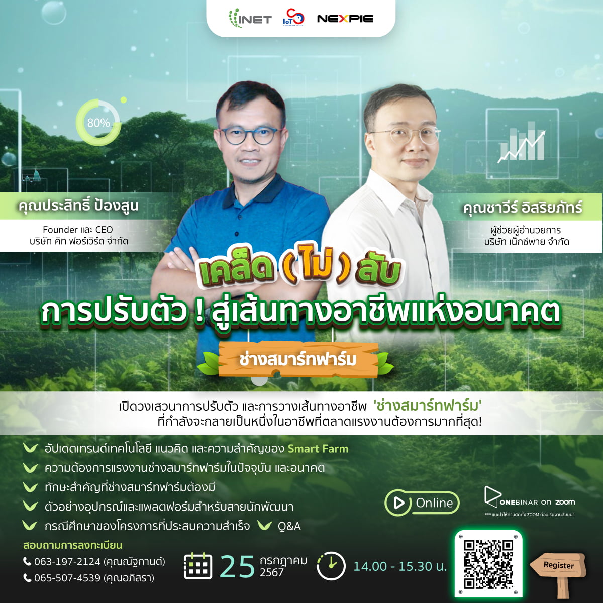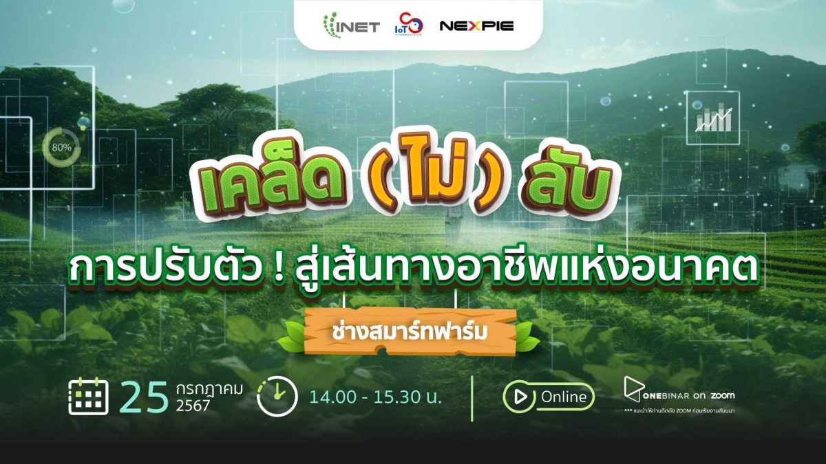 งานสัมมนาออนไลน์ ลงทะเบียนฟรี! ผ่าน Onebinarหัวข้อ เคล็ด (ไม่) ลับการปรับตัว! สู่เส้นทางอาชีพแห่งอนาคต ” ช่างสมาร์ทฟาร์ม “วันพฤหัสบดีที่ 25 กรกฎาคม พ.ศ.2567 เวลา 14.00 – 15.30 น.