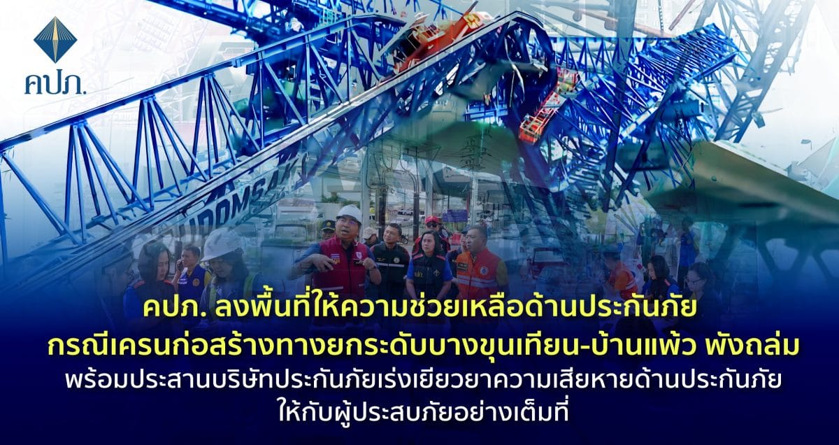 จากกรณีคานปูน (Segment) และเครน (Launching Gantry Crane) ซึ่งเป็นชิ้นส่วนและอุปกรณ์ที่ใช้ก่อสร้างทางยกระดับ โครงการก่อสร้างทางหลวงพิเศษหมายเลข 82 สายทางยกระดับบางขุนเทียน-บ้านแพ้ว ช่วงเอกชัย-บ้านแพ้ว ตอน 1 หมู่ที่ 2 ตำบลคอกกระบือ อำเภอเมือง จังหวัดสมุทรสาคร ได้พังถล่มลงมาระหว่างการก่อสร้าง ส่งผลทำให้มีผู้เสียชีวิต 6 ราย และบาดเจ็บ 9 คน เหตุเกิดเมื่อวันที่ 29 พฤศจิกายน 2567 นั้น เบื้องต้นสายส่งเสริมและประกันภัยภูมิภาค สำนักงาน คปภ. ภาค 7 (นครปฐม) และสำนักงาน คปภ. จังหวัดสมุทรสาคร ในฐานะพื้นที่เกิดเหตุเร่งบูรณาการร่วมกับหน่วยงานที่เกี่ยวข้องเพื่อตรวจสอบการทำประกันภัยและติดตามรายงานความเสียหายอย่างเร่งด่วนผ่าน Platform การรายงานข้อมูลกรณีอุบัติภัยกลุ่มหรือรายใหญ่ด้วยระบบอิเล็กทรอนิกส์ รวมทั้งลงพื้นที่เพื่ออำนวยความสะดวกด้านประกันภัยให้กับผู้ประสบภัยและครอบครัว เพื่อนำระบบประกันภัยช่วยบรรเทาความเดือดร้อนให้กับครอบครัวของผู้เสียชีวิตและผู้บาดเจ็บได้อย่างมีประสิทธิภาพและเป็นธรรม