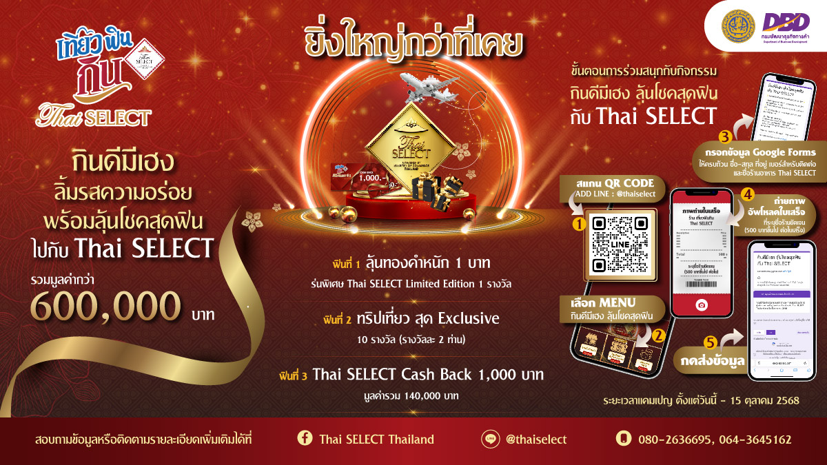 นอกจากนี้ ยังมอบโชคใหญ่สำหรับสายกิน สายเที่ยว ที่มารับประทานอาหาร ณ ร้านอาหารที่ได้รับตราสัญลักษณ์ Thai SELECT ทั่วประเทศ กับกิจกรรม ‘กินดีมีเฮง’ ลิ้มรสความอร่อยพร้อมลุ้นโชคสุดฟินคูณสาม รวมมูลค่ากว่า 600,000 บาท ได้แก่ ฟินที่ 1 ลุ้นทองคำหนัก 1 บาท ซึ่งเป็นรุ่นพิเศษ Thai SELECT Limited Edition ฟินที่ 2 ทริปท่องเที่ยวสุดเอ็กซ์คลูซีฟตามรอยร้าน Thai SELECT และ ฟินที่ 3 Thai SELECT Cash Back รับสิทธิ์ลุ้น Cash Back รวมมูลค่ากว่า 140,000 บาท เพียงรับประทานอาหารที่ร้าน Thai SELECT ครบ 500 บาทขึ้นไป และส่งภาพใบเสร็จ พร้อมกรอกรายละเอียดตามแบบฟอร์มที่ LINE Official Account: @thaiselect โดยใบเสร็จ 1 ใบ ลุ้นโชคได้ 1 สิทธิ์ สามารถส่งใบเสร็จร่วมกิจกรรมได้ไม่จำกัดจำนวนครั้ง ตั้งแต่วันนี้ ไปจนถึงวันที่ 15 ตุลาคม 2568