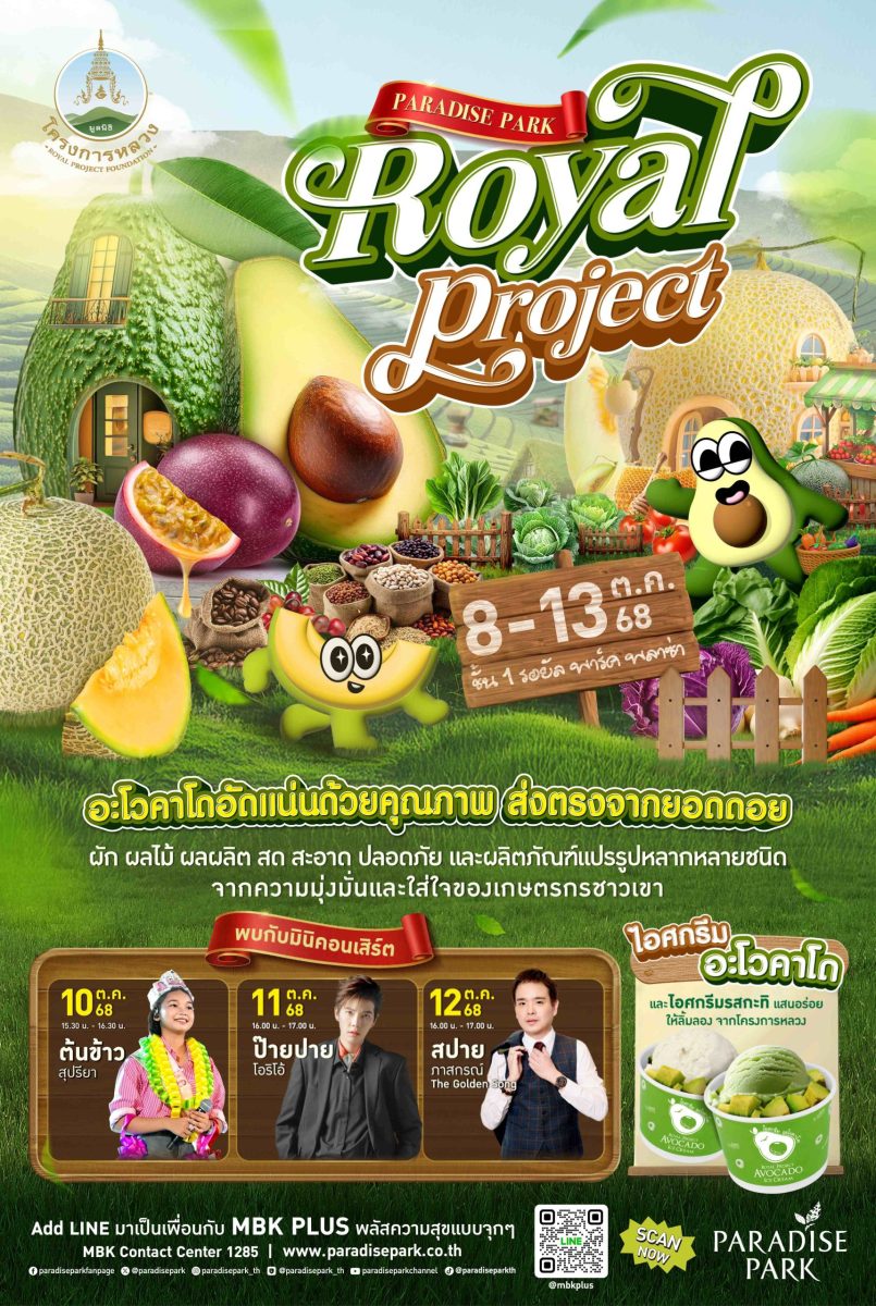 พาราไดซ์ พาร์ค ศูนย์การค้าในเครือเอ็ม บี เค ร่วมกับ มูลนิธิโครงการหลวง ส่งมอบความอร่อย สด ใหม่ กับสุดยอดผลิตภัณฑ์ที่อัดแน่นคุณภาพจาก ยอดดอย ใน งาน Paradise Park Royal Project 2025 พบกับอะโวคาโด อัดแน่นด้วยคุณภาพ ส่งตรงจากยอดดอย รวมทั้งผัก ผลไม้ ผลผลิต สด สะอาด ปลอดภัย และผลิตภัฒฑ์แปรรูปหลากหลายชนิด จากความมุ่งมั่นและใส่ใจของเกษตรกรชาวเขา สินค้าไฮไลท์ที่พลาดไม่ได้ อย่าง ไอศกรีมอะโวคาโด และไอศกรีมกะทิ (ทุ่งเริง) และสินค้าจากโครงการหลวง ผลผลิตและผลิตภัณฑ์แปรรูป อาทิ อะโวคาโด เสาวรสหวาน ผักสดปลอดสารพิษ ธัญพืช ชาพันธุ์ดี ชาจีนอู่หลวง ชาเขียว ชาแดง และผลิตภัณฑ์สมุนไพร เซรั่มบำรุงผิว แชมพู ครีมนวดผม เจลอาบน้ำ และบูธร้านค้าอื่น ๆ เช่น ร้านดอยตุง ร้านดอยคำ ร้านใบเมี่ยง ร้านโมจิครีมชีส อะโวคาโด ผลไม้สด ร้านน้ำอะโวคาโดปั่น และสินค้าหัตถกรรมไทย เสื้อผ้าพื้นเมือง