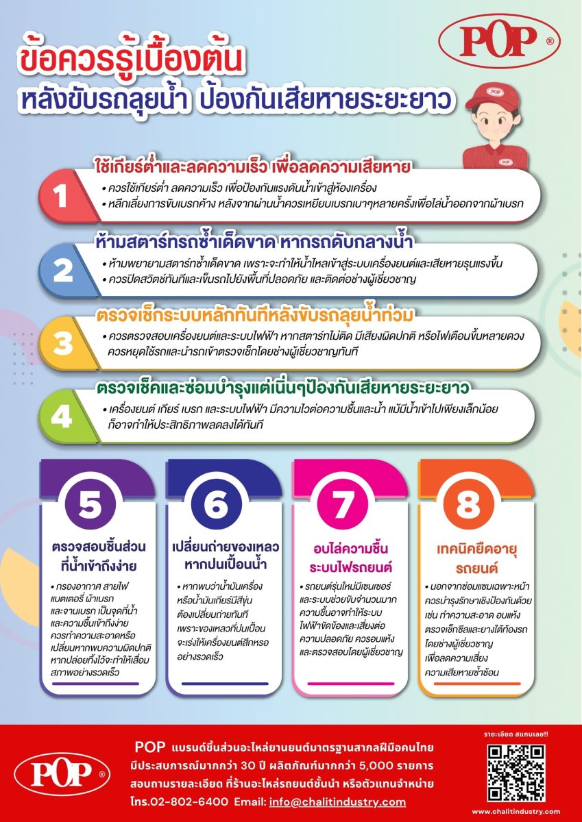 นายชวิศ ยงเห็นเจริญ กรรมการผู้จัดการ บริษัท ชลิต อินดัสทรี จำกัด ผู้ผลิตและจำหน่ายชิ้นส่วนยานยนต์ภายใต้แบรนด์ “POP” ซึ่งเป็นชิ้นส่วนอะไหล่ยานยนต์มาตรฐานสากลฝีมือคนไทยที่มีประสบการณ์มากกว่า 30 ปี ให้คำแนะนำเบื้องต้นเกี่ยวกับวิธีดูแลรถหลังลุยน้ำท่วม ว่า การตรวจเช็กและดูแลรถทันทีหลังลุยน้ำเป็นสิ่งที่ไม่ควรมองข้าม เพื่อป้องกันความเสียหายที่อาจเกิดขึ้นในระยะยาว โดยมีข้อควรรู้ดังนี้