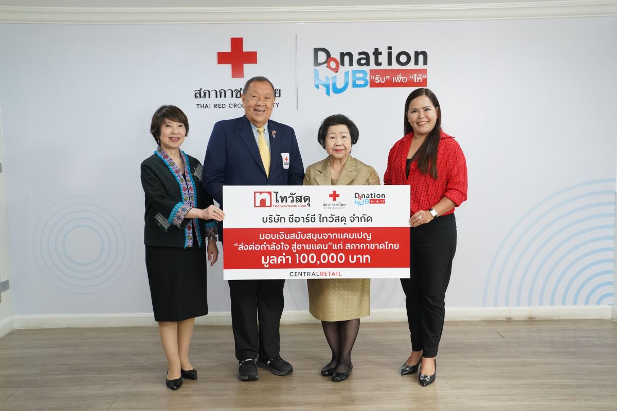 นางปาริชาติ ยามวินิจ ที่ปรึกษาประธานเจ้าหน้าที่บริหาร บริษัท ซีอาร์ซี ไทวัสดุ จำกัด ในเครือเซ็นทรัล รีเทล (ลำดับที่ 3 จากซ้าย) และ นางสาวชุติพร คงเจริญสุข ผู้ช่วยกรรมการผู้จัดการใหญ่ ฝ่ายการตลาด บริษัท ซีอาร์ซี ไทวัสดุ จำกัด ในเครือเซ็นทรัล รีเทล (ลำดับที่ 4 จากซ้าย) ร่วมมอบเงินบริจาคจำนวน 100,000 บาท ให้แก่ สภากาชาดไทย เพื่อสนับสนุนภารกิจช่วยเหลือผู้ประสบภัยจากสถานการณ์ชายแดนไทย–กัมพูชา ภายใต้แคมเปญ ไทวัสดุ “ส่งต่อกำลังใจ สู่ชายแดน” โดยมี นายขรรค์ ประจวบเหมาะ ผู้อำนวยการสำนักงานจัดหารายได้ สภากาชาดไทย (ลำดับที่ 2 จากซ้าย) และ นางจันทร์ประภา วิชิตชลชัย รองผู้อำนวยการสำนักงานจัดหารายได้ สภากาชาดไทย (ลำดับที่ 1 จากซ้าย) เป็นผู้รับมอบ ณ สำนักงานจัดหารายได้ สภากาชาดไทย