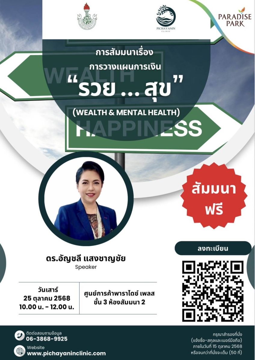 ในยุคที่เศรษฐกิจผันผวนและค่าครองชีพพุ่งสูงอย่างต่อเนื่อง ปัญหาทางการเงินกลายเป็นเรื่องใกล้ตัวที่ส่งผลกระทบต่อคุณภาพชีวิตของทุกคน “การวางแผนการเงิน” จึงเป็นสิ่งสำคัญและจำเป็น ไม่เพียงเพื่อสร้างความมั่นคงและมั่งคั่งทางการเงินเท่านั้น แต่ยังเป็นกุญแจสำคัญในการสร้าง “ความสงบสุขทางใจ” (Peace of Mind) ซึ่งมีผลโดยตรงต่อสุขภาพจิตที่ดี และความสุขในชีวิตประจำวัน สมาคมภริยาแพทย์แห่งประเทศไทยในพระบรมราชูปถัมภ์สมเด็จพระศรีนครินทราบรมราชชนนี พิชญานิน คลินิก และ พาราไดซ์ พาร์ค ศูนย์การค้าในเครือเอ็ม บี เค ชวนคุณมาสัมมนา เรื่อง “การวางแผนการเงิน รวย…สุข” พบกับวิทยากร ดร.อัญชลี แสงชาญชัย ที่จะมาแบ่งปันความรู้และแนวทางการวางแผนการเงินส่วนบุคคล (ขั้นพื้นฐาน) เพื่อให้คุณสามารถใช้ชีวิตได้อย่างมีเป้าหมายและมีความสุขอย่างแท้จริง