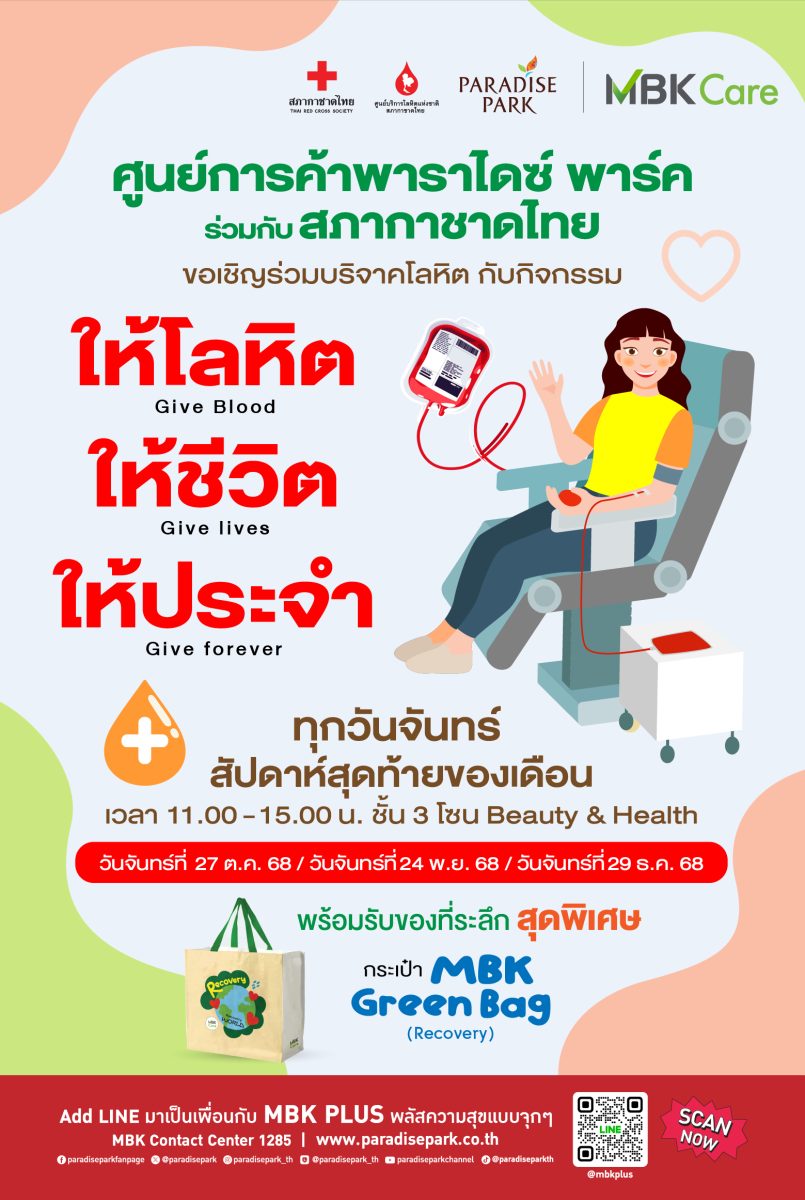 มาร่วมส่งต่อการให้ที่ไม่สิ้นสุด กับกิจกรรม “ให้โลหิต ให้ชีวิต ให้ประจำ” ทุกวันจันทร์สุดท้ายของเดือน ในวันจันทร์ที่ 27 ตุลาคม วันจันทร์ 24 พฤศจิกายน และ วันจันทร์ 29 ธันวาคม 2568 ตั้งแต่เวลา 11.00 น. – 15.00 น. ณ ชั้น 3 โซน Beaty & Health ศูนย์การค้าพาราไดซ์ พาร์ค