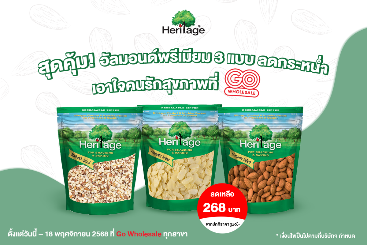 แบรนด์เฮอริเทจ ผลิตภัณฑ์ถั่ว ธัญพืช และผลไม้อบแห้ง พรีเมียม สำหรับเป็นวัตถุดิบประกอบอาหาร จัดโปรโมชั่นพิเศษสำหรับคนรักถั่วอัลมอนด์ ได้แก่ เฮอริเทจ อัลมอนด์ดิบสไลด์ ขนาด 454 กรัม, เฮอริเทจ อัลมอนด์ดิบหั่น (ชิ้นกลาง) ขนาด 454 กรัมและ อัลมอนด์ดิบ เม็ดเต็ม ขนาด 500 กรัม จากราคาปกติ 355 บาท ลดเหลือเพียง 268 บาท ที่ Go Wholesale ทุกสาขา ตั้งแต่วันนี้ – 18 พฤศจิกายน 2568