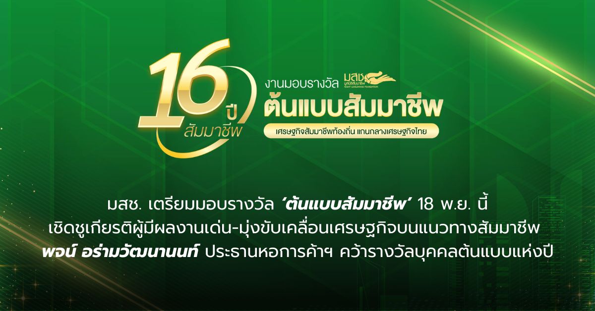 สำหรับการจัดงานมอบรางวัลต้นแบบสัมมาชีพในปีนี้ จัดขึ้นภายใต้แนวคิด “เศรษฐกิจสัมมาชีพท้องถิ่น แกนกลางเศรษฐกิจไทย” เพื่อสะท้อนให้เห็นว่า การพัฒนาเศรษฐกิจชุมชนและท้องถิ่นบนฐานของหลักสัมมาชีพ ไม่เพียงแต่เป็นการเสริมสร้างความเข้มแข็งให้กับเศรษฐกิจฐานรากเท่านั้น แต่ยังทำให้เกิดการพัฒนาที่สมดุลทั้งด้านเศรษฐกิจ สังคม และสิ่งแวดล้อม อันเป็นรากฐานสำคัญที่จะผลักดันให้เศรษฐกิจไทยเติบโตอย่างมั่นคงและยั่งยืน โดยในงานดังกล่าวจะมีการมอบรางวัล 4 ประเภทได้แก่ รางวัลบุคคลต้นแบบสัมมาชีพ รางวัลวิสาหกิจชุมชนต้นแบบสัมมาชีพ รางวัลเอสเอ็มอีต้นแบบสัมมาชีพ และรางวัลปราชญ์ชาวบ้านต้นแบบสัมมาชีพ กำหนดการจัดงานมอบรางวัล ในวันอังคารที่ 18 พฤศจิกายน 2568 เวลา 17.00–21.00 น. ณ ห้องคอนเวนชั่น เซ็นเตอร์ โรงแรมรามา การ์เด้นส์ กรุงเทพฯ