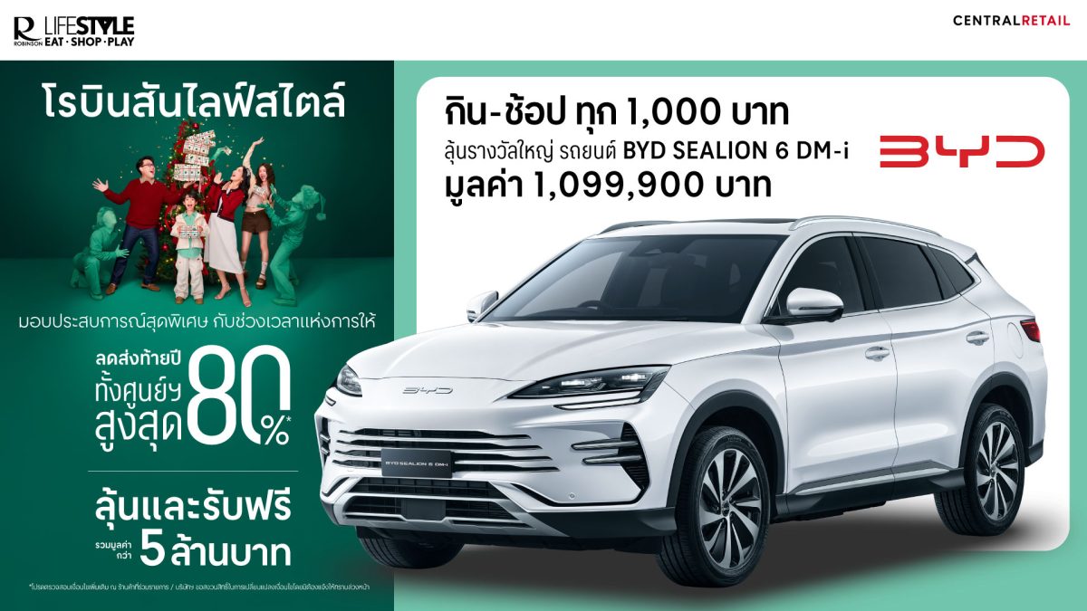 ร่วมเป็นส่วนหนึ่งของประสบการณ์แห่งความสุขส่งท้ายปี กับแคมเปญ “โรบินสันไลฟ์สไตล์ มอบประสบการณ์พิเศษ กับช่วงเวลาแห่งการให้” เพียงช้อปครบตามเงื่อนไข รับสิทธิ์ลุ้นรางวัลใหญ่รถยนต์ปลั๊กอินไฮบริด BYD รุ่น SEALION 6 DM-i  มูลค่า 1.09 ล้านบาทพร้อมดีลสุดคุ้มจากหลากหลายร้านค้า ตั้งแต่วันนี้ – 4 ม.ค. 69 ที่ศูนย์การค้าโรบินสันไลฟ์สไตล์ทุกสาขา ทั่วประเทศ