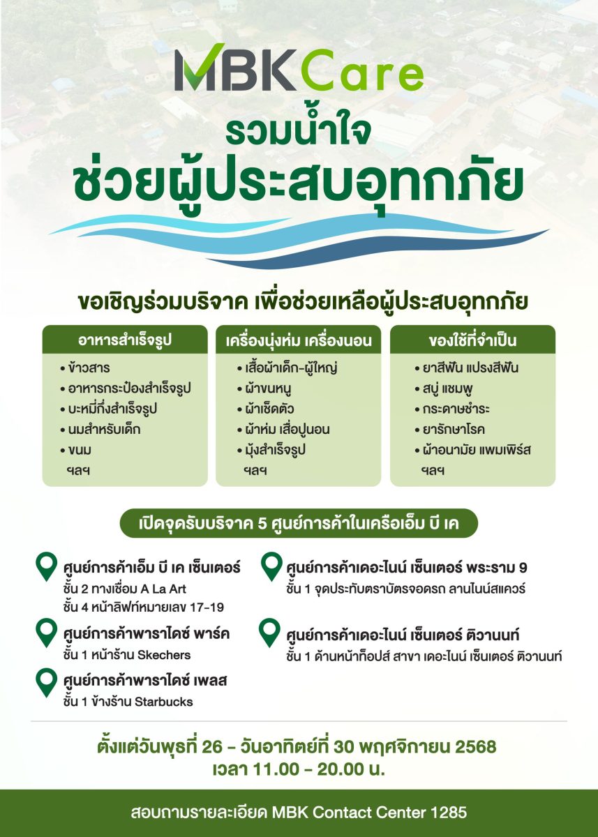 บริษัท เอ็ม บี เค จำกัด (มหาชน) และกลุ่มธุรกิจในเครือ ขอร่วมส่งกำลังใจให้พี่น้องผู้ประสบอุทกภัยในพื้นที่ภาคใต้ พร้อมเชิญชวนประชาชน นำของมาร่วมบริจาคเพื่อช่วยเหลือผู้ประสบอุทกภัย ภายใต้โครงการ MBK Care รวมน้ำใจช่วยผู้ประสบอุทกภัย โดยเปิดรับบริจาค