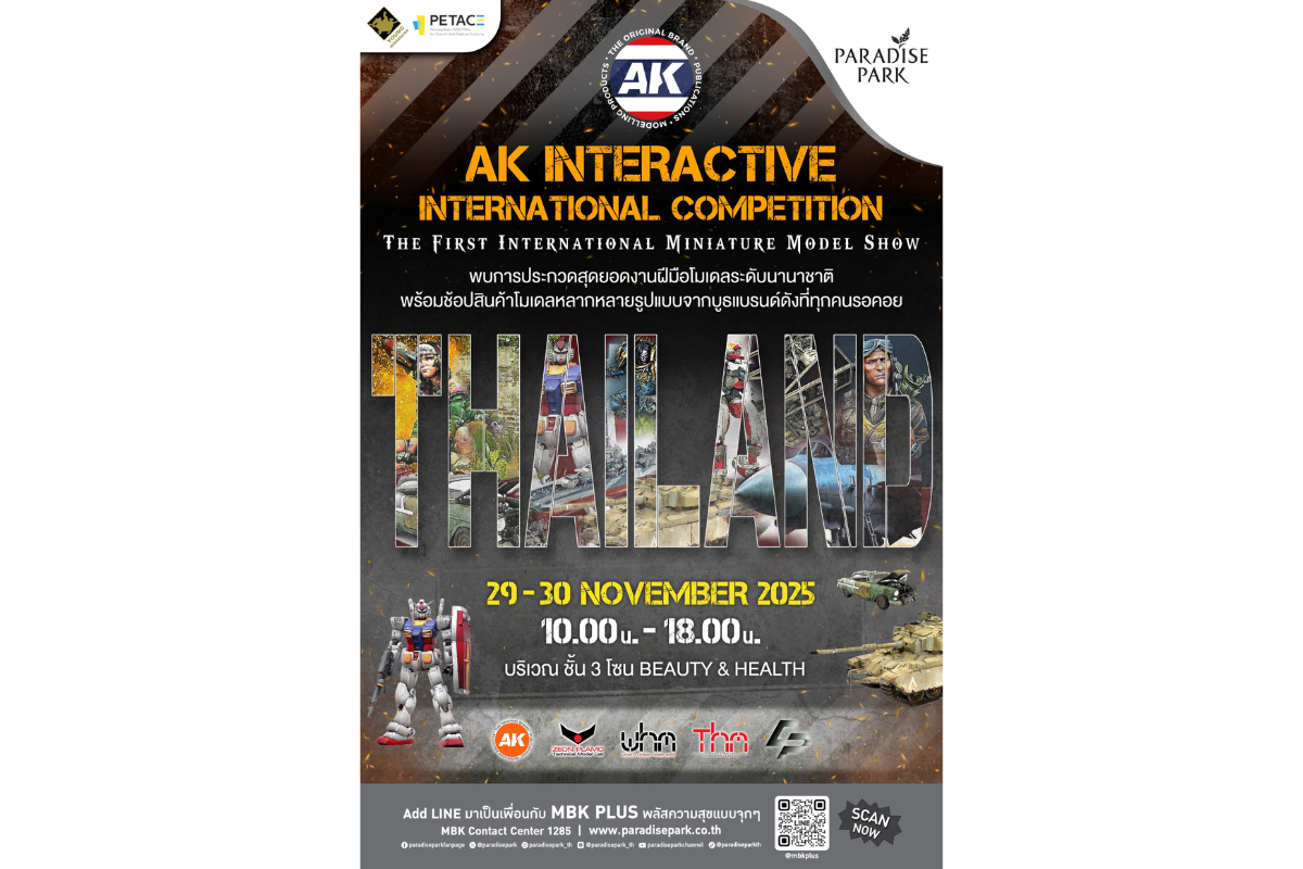 พาราไดซ์ พาร์ค ศูนย์การค้าในเครือเอ็ม บี เค ร่วมกับ สำนักงานคณะกรรมการบริหารรัฐปีนังด้านการท่องเที่ยวและเศรษฐกิจสร้างสรรค์ AK Thailand, Takeshi Hobby Miniature, WHM, ZEON PLAMO และ DP Hobby ชวนนักสะสมและแฟนคลับโมเดล มางาน AK INTERACTIVE INTERNATIONAL COMPETITION THAILAND 2025 ภายในงาน จะได้สัมผัสโลกของโมเดลที่เต็มไปด้วยความคิดสร้างสรรค์ พร้อมโอกาส แลกเปลี่ยนความรู้และประสบการณ์กับนักสะสมมืออาชีพและผู้ผลิตโมเดลชื่อดัง นอกจากนี้ยังมีการแข่งขันประกวดสุดยอดงานฝีมือโมเดลระดับนานาชาติ และร้านจำหน่ายโมเดลหลากหลายรูปแบบจากบูธแบรนด์ดัง ที่นักสะสมทุกคนรอคอย