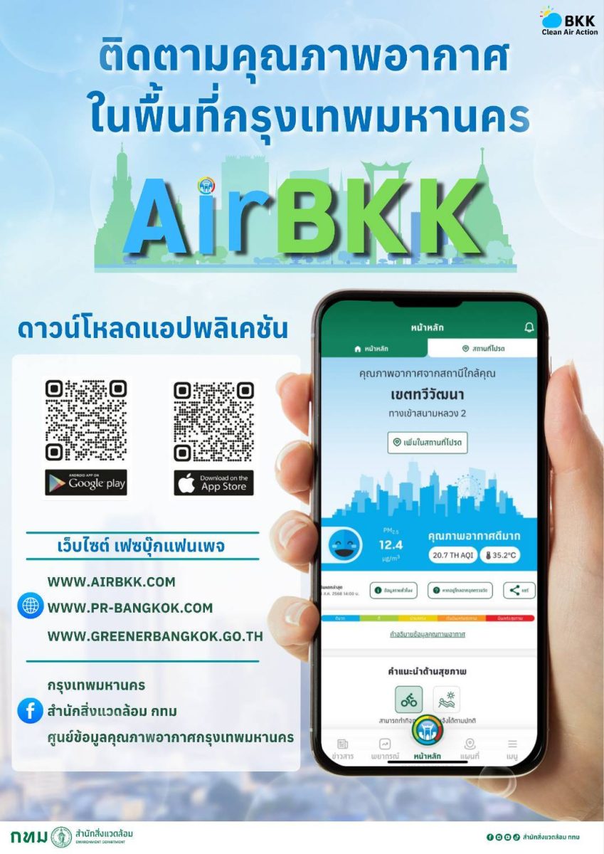 ทั้งนี้ ประชาชนสามารถติดตามสถานการณ์คุณภาพอากาศได้อย่างต่อเนื่องผ่านช่องทางต่าง ๆ ได้แก่ เว็บไซต์ www.airbkk.com เว็บไซต์ประชาสัมพันธ์กรุงเทพมหานคร www.pr-bangkok.com เฟซบุ๊ก “ศูนย์ข้อมูลคุณภาพอากาศกรุงเทพมหานคร” เฟซบุ๊ก “สำนักสิ่งแวดล้อม กรุงเทพมหานคร” เฟซบุ๊ก “กรุงเทพมหานคร” แอปพลิเคชัน AirBKK ทั้งระบบ iOS และ Android รวมถึงจอแสดงผล ณ สถานีตรวจวัดและจอเคลื่อนที่ภายในสวนสาธารณะ รวมทั้งขอความร่วมมือประชาชนช่วยสอดส่องแหล่งกำเนิดมลพิษ หากพบรถปล่อยควันดำ หรือจุดเสี่ยง สามารถแจ้งผ่านระบบ Traffy Fondue เพื่อร่วมกันแก้ไขปัญหามลพิษทางอากาศอย่างยั่งยืนต่อไป