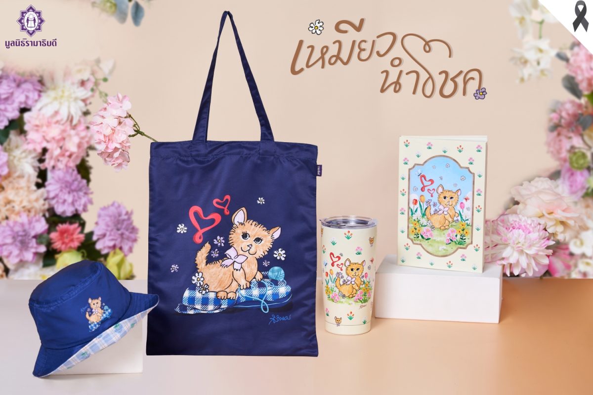 ของที่ระลึกการกุศลจากภาพวาดฝีพระหัตถ์ “เหมียวนำโชค” ประกอบด้วย เสื้อยืด (สีครีม น้ำเงิน โอรส) ผู้ใหญ่ ราคา 199 บาท เด็ก ราคา 169 บาท, เสื้อสเวตเตอร์ (สีชมพู กรมท่า) ราคา 499 บาท, ชุดนอนแบบเสื้อกางเกงขาสั้น (สีโอรส ฟ้า-ครีม) ราคา 699 บาท, ผ้าพันคอ (สีโอรส) ราคา 399 บาท, หมวกกลับด้าน (สีโอรส กรมท่า) ราคา 350 บาท, กระเป๋าถือผ้าแคนวาส 2 ขนาด ราคา 279 บาท (สีเขียว-ฟ้า โอรส ฟ้า-ครีม) และ ราคา 350 บาท (สีโอรส เหลือง ฟ้า-ครีม), กระเป๋าพับเก็บ (ฟ้า-ครีม เขียว-ฟ้า) ราคา 139 บาท, กระเป๋าผ้าไมโคร (สีโอรส กรมท่า เขียว-ฟ้า) ราคา 79 บาท, กระบอกเก็บอุณหภูมิ (สีฟ้า-ครีม เขียว-ฟ้า) ราคา 350 บาท, แก้วเก็บอุณหภูมิ (สีครีม) ราคา 329 บาท
