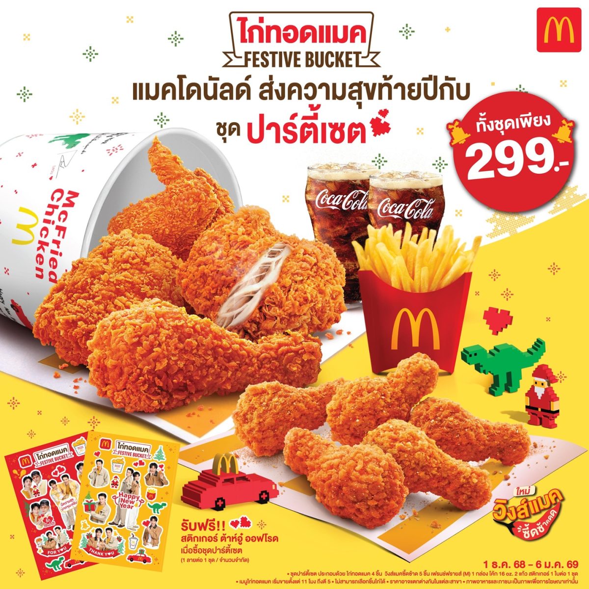 แมคโดนัลด์ ร่วมฉลองเทศกาลแห่งความสุขส่งท้ายปีกับไก่ทอดแมคชุดพิเศษ ให้ทุกคนได้มาแชร์กันกับ ‘บักเก็ตสุขเต็มถัง’ จัดเต็มไก่ทอดแมค กรอบ ฉ่ำถึงใจ อร่อยถึงเนื้อ คุ้มสุดๆ ทุกงานปาร์ตี้ ในชุดประกอบด้วย ไก่ทอดแมค 4 ชิ้น, วิงส์แมคซี้ดซ้าด 5 ชิ้น, เฟรนซ์ฟรายส์ ขนาดกลาง 1 กล่อง และ โค้ก ขนาด 16 ออนซ์ 2 แก้ว ราคาเพียง 299 บาท และสำหรับกรุ๊ปใหญ่ห้ามพลาด! ‘บักเก็ตปาร์ตี้ฟินเวอร์’ ยิ่งแชร์ยิ่งคุ้ม ปาร์ตี้สนุก อิ่มอร่อย กับไก่ทอดแมคถึง 5 ชิ้น แมคนักเก็ต 10 ชิ้น ปาร์ตี้ฟรายส์ ใหญ่เวอร์ 1 กล่อง และ โค้ก ขนาด 16 ออนซ์ 2 แก้ว ราคาเพียง 399 บาท