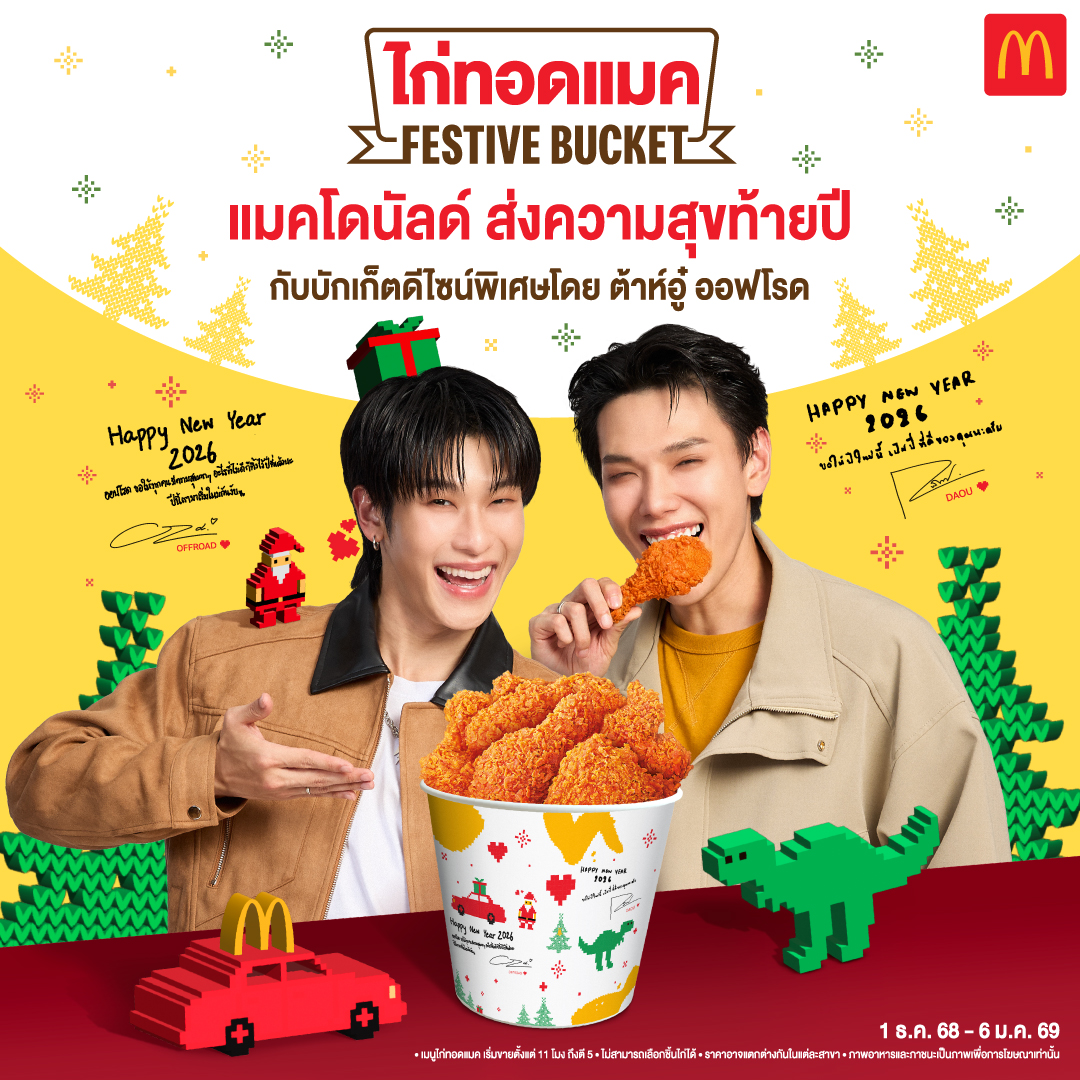 เตรียมสะสมบักเก็ตดีไซน์โดย ‘ต้าห์อู๋ x ออฟโรด’ และสติกเกอร์สุดคิวท์ ได้แล้ววันนี้ ทั้ง ‘บักเก็ตสุขเต็มถัง’ เพียงชุดละ 299 บาท และ ‘บักเก็ตปาร์ตี้ฟินเวอร์’ ราคาชุดละ 399 บาท ตั้งแต่วันนี้ – 6 มกราคม 2569 ที่ร้านแมคโดนัลด์ ทุกสาขาที่ร่วมรายการ, แมคไดร์ฟ ทรู และแมคดิลิเวอรี โทร.1711, เว็บไซต์ www.mcdonalds.co.th ติดตามรายละเอียดเพิ่มเติมได้ที่ Facebook.com/McThai