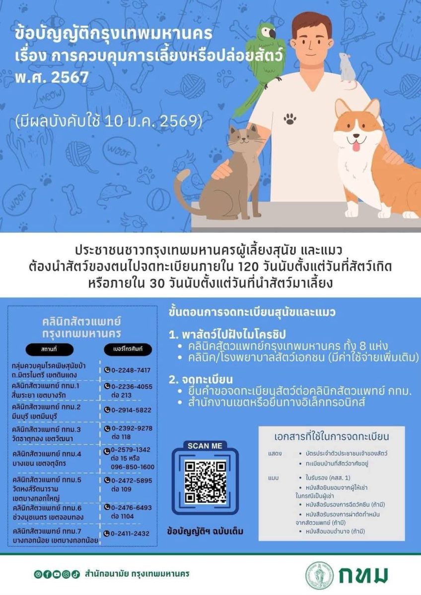 นางดวงพร ปิณจีเสคิกุล ผู้อำนวยการสำนักอนามัย (สนอ.) กทม. กล่าวถึงการเตรียมความพร้อมรองรับการประกาศใช้ข้อบัญญัติ กทม. เรื่อง การควบคุมการเลี้ยงสัตว์ หรือปล่อยสัตว์ พ.ศ. 2567 ซึ่งจะมีผลบังคับใช้ในวันที่ 10 ม.ค. 69 ว่า กทม. ได้จัดเตรียมสถานที่เพื่อให้บริการจดทะเบียนสุนัข โดยประชาชนสามารถนำสัตว์เลี้ยงเข้ารับบริการได้ที่กลุ่มควบคุมโรคพิษสุนัขบ้า ถนนมิตรไมตรี เขตดินแดง โทร. 0 2245 3311 และ 0 2248 7417 รวมถึงคลินิกสัตวแพทย์ กทม. ทั้ง 7 แห่ง ได้แก่ คลินิกสัตวแพทย์ กทม. 1 สี่พระยา เขตบางรัก โทร. 0 2236 4055 ต่อ 213 คลินิกสัตวแพทย์ กทม. 2 มีนบุรี เขตมีนบุรี โทร. 0 2914 5822 คลินิกสัตวแพทย์ กทม. 3 วัดธาตุทอง เขตวัฒนา โทร. 0 2391 6082 คลินิกสัตวแพทย์ กทม. 4 บางเขน เขตจตุจักร โทร. 0 2579 1342 คลินิกสัตวแพทย์ กทม. 5 วัดหงส์รัตนาราม เขตบางกอกใหญ่ โทร. 0 2472 5895 ต่อ 109 คลินิกสัตวแพทย์ กทม. 6 ช่วง นุชเนตร เขตจอมทอง โทร. 0 2476 6493 ต่อ 1104 และคลินิกสัตวแพทย์ กทม. 7 บางกอกน้อย โทร. 0 2411 2432 รวมทั้งยังมีบริการหน่วยสัตวแพทย์เคลื่อนที่ออกให้บริการในชุมชน โดยประชาชนสามารถติดตามข้อมูลการออกหน่วยสัตวแพทย์เคลื่อนที่ทางเฟซบุ๊กกรุงเทพมหานคร เฟซบุ๊กสำนักอนามัย และเฟซบุ๊กกลุ่มควบคุมโรคพิษสุนัขบ้า สำนักงานสัตวแพทย์สาธารณสุข