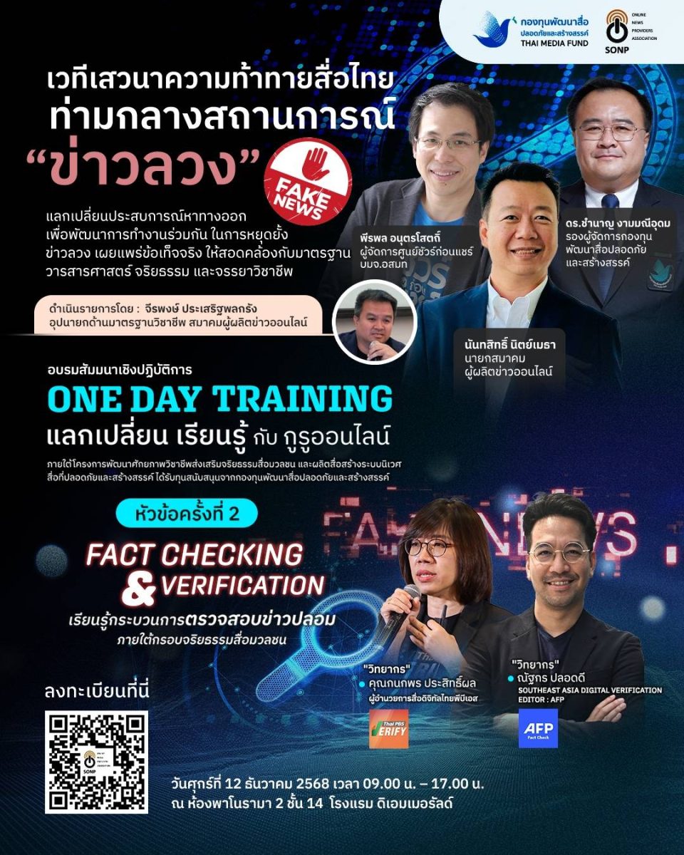 สมาคมผู้ผลิตข่าวออนไลน์ (SONP) ร่วมกับ กองทุนพัฒนาสื่อปลอดภัยและสร้างสรรค์ ภายใต้ โครงการความร่วมมือองค์กรสื่อขับเคลื่อนพัฒนาวิชาชีพและส่งเสริมจริยธรรมสื่อเพื่อสร้างระบบนิเวศสื่อปลอดภัยและสร้างสรรค์ จัดโครงการฝึกอบรม One Day Training แลกเปลี่ยน – เรียนรู้กับกูรูออนไลน์ ประจำปี 2568 ครั้งที่ 2 ในวันศุกร์ที่ 12 ธันวาคม 2568 ณ โรงแรม ดิเอมเมอรัลด์ ถนนรัชดาภิเษก กรุงเทพฯ ในหัวข้อ Fact Checking & Verification เรียนรู้กระบวนการตรวจสอบข่าวปลอม ภายใต้กรอบจริยธรรมสื่อมวลชน