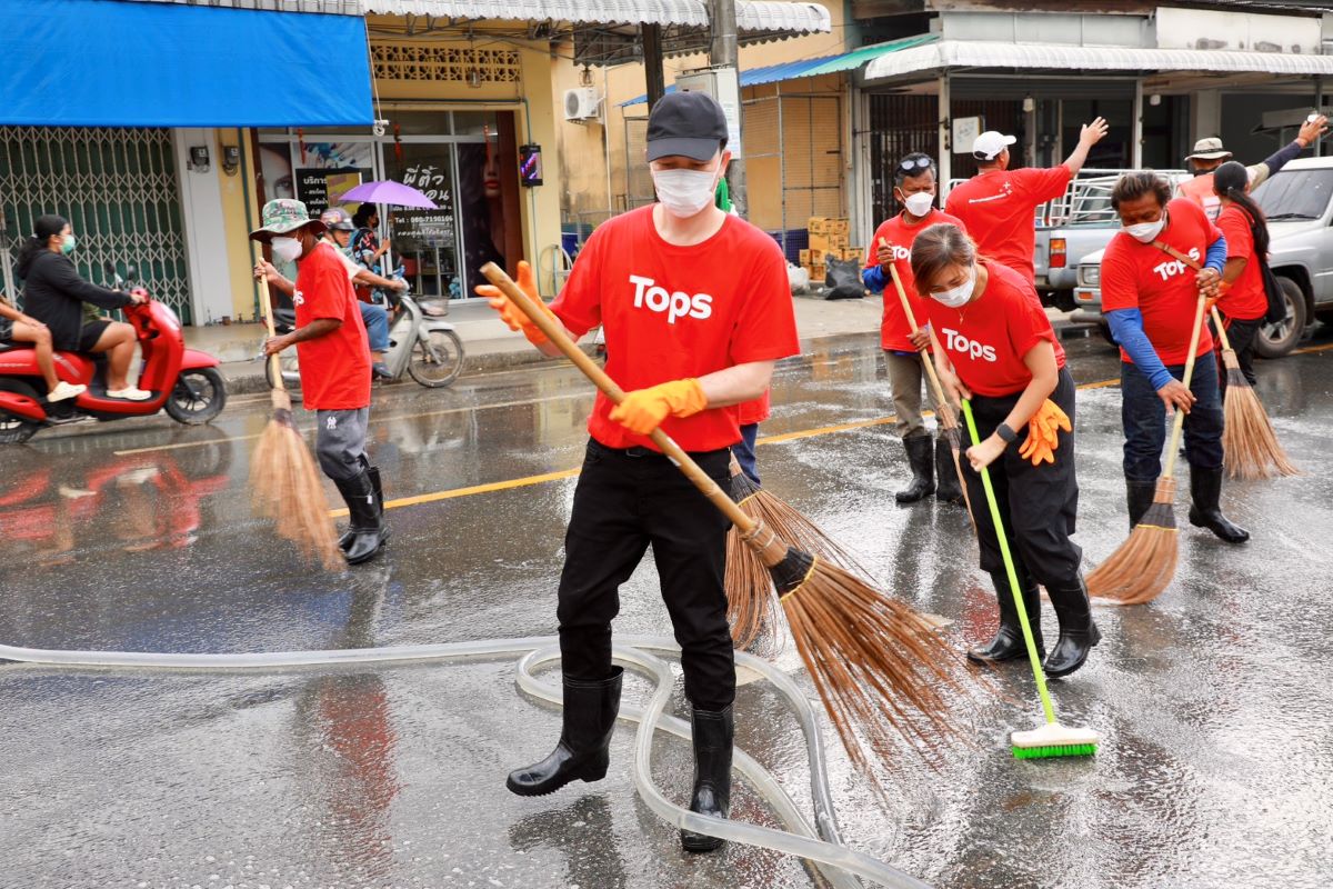 - การฟื้นฟูชุมชน (Community Recovery) โดยในก่อนหน้านี้ในช่วงของภาวะวิกฤติท็อปส์ได้ดำเนินการลงพื้นที่ครอบคลุมอำเภอหาดใหญ่ เพื่อแจกจ่ายถุงปันน้ำใจ และสินค้าอุปโภคบริโภคจากพันธมิตรคู่ค้าไปแล้ว 14,300 ถุง รวมมูลค่า 12,840,000 บาท และเมื่อสถานการณ์เริ่มเข้าสู่ภาวะน้ำลด ท็อปส์ยังคงเดินหน้าช่วยเหลือต่อเนื่องด้วยภารกิจ “TOPS Rebuild Hat Yai Community Cleaning Day” ฟื้นฟูชุมชนหลังน้ำลดอย่างเร่งด่วน ประสานความร่วมมือกับทางจังหวัดสงขลา โดยมี นายจิรวัตร์ มณีโชติ รองผู้ว่าราชการจังหวัดสงขลา เป็นประธานในกิจกรรมดังกล่าว ร่วมกับ หน่วยเฉพาะกิจชุดช่วยเหลือผู้ประสบภัยหาดใหญ่ หน่วยกองร้อยฝึกรบพิเศษที่ 4 ที่ อ. สิชล จังหวัดนครศรีธรรมราช, กองกำลังอาสาสมัครรักษาดินแดน จังหวัดเพชรบูรณ์, เทศบาลนครหาดใหญ่, และพนักงานจิตอาสา TOPSTER จิตอาสาชุมชน รวมจำนวนกว่า 100 คน ลงพื้นที่อำเภอหาดใหญ่ จังหวัดสงขลา เพื่อร่วมทำความสะอาดถนนคลองเรียน 2 ระยะทางกว่า 800 เมตร ทั้งการขนย้ายเศษซากขยะ ฉีดล้างพื้นถนน และกวาดล้างเศษโคลนที่เกาะพื้นถนนเส้นหลักที่ได้รับผลกระทบ รวมถึงส่งมอบถุงยังชีพให้ชุมชนคลองเรียน ชุมชนร่มเย็น และบริเวณท็อปส์ สาขาเซ็นทรัล หาดใหญ่ และส่งมอบ TOPS Rebuild Hat Yai Kit ถุงเครื่องมือทำความสะอาดแก่คนในชุมชน และอาหาร สิ่งของจำเป็นให้แก่ครัวเรือนทั่วจังหวัดที่ได้รับผลกระทบตลอดจนการส่งต่ออาหารและของใช้จำเป็นจากหลากหลายแบรนด์อย่างต่อเนื่อง พร้อมกันนี้ยังจัดโปรโมชั่นพิเศษลดราคาสินค้ากลุ่มผลิตภัณฑ์ทำความสะอาดสูงสุด 50% พร้อมมอบสิทธิพิเศษผ่อน 0% นานสูงสุด 6 เดือน จากบัตรเครดิตที่ร่วมรายการ ตั้งแต่วันนี้ – 31 ธันวาคม 2568 ที่ ท็อปส์ สาขาเซ็นทรัล หาดใหญ่, สาขาหาดใหญ่ วิลเลจ, สาขาหาดใหญ่ ซิตี้, สาขาเซ็นทรัล นครศรีธรรมราช 2, สาขาเซ็นทรัล สุราษฎร์ธานี, สาขาโรบินสันไลฟ์สไตล์ ตรัง, สาขาพะงัน, สาขาเฮเว่นสมุย และ ท็อปส์ ฟู้ด ฮอลล์ สาขาเซ็นทรัล สมุย, รวมถึงช่องทางออนไลน์ผ่าน TOPS ONLINE เพื่อสนับสนุนการฟื้นฟูเมืองหาดใหญ่ให้ประชาชนสามารถกลับมาดำเนินชีวิตประจำวันได้อย่างปลอดภัย มั่นคง และเร็วที่สุด