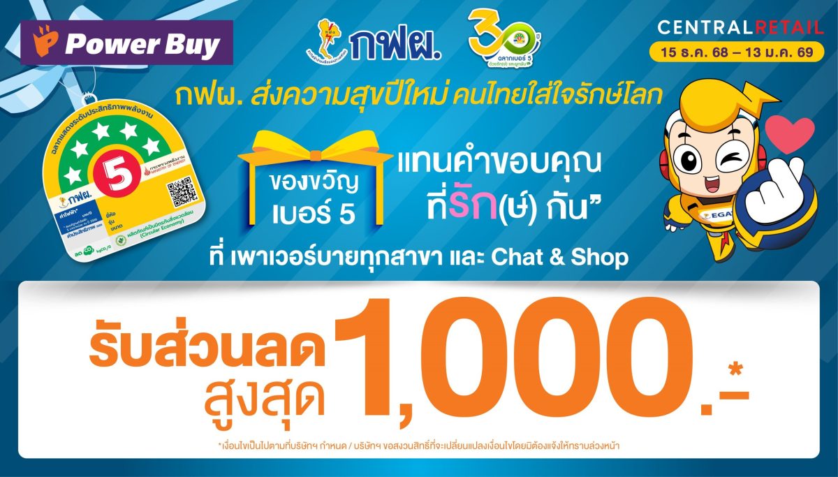 เพาเวอร์บาย ผนึก กฟผ. แจกส่วนลด 1,000 บาท ช้อปเครื่องใช้ไฟฟ้าเบอร์ 5 ต้อนรับปีใหม่ 2569 ตั้งแต่ 15 ธันวาคม 2568 – 13 มกราคม 2569
