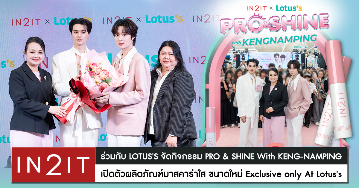IN2IT (อินทูอิท) ร่วมกับ Lotus’s (โลตัส) ร่วมจัดกิจกรรม “PRO & SHINE With KENG-NAMPING” โดยมีสองนักแสดงมากความสามารถอย่าง เก่ง-หฤษฎ์ บัวย้อย และ น้ำปิง-นภัสกร ปิงเมือง มาร่วมแสดงความยินดี และทำกิจกรรมร่วมกับทางแบรนด์ เพื่อสร้างสีสันภายในงานเปิดตัวผลิตภัณฑ์ IN2IT Pro-Lash Mascara & Base ขนาดใหม่ (4 กรัม) Exclusive Only at Lotus’s ซึ่งจัดขึ้นที่โลตัส สาขา สุขุมวิท 50